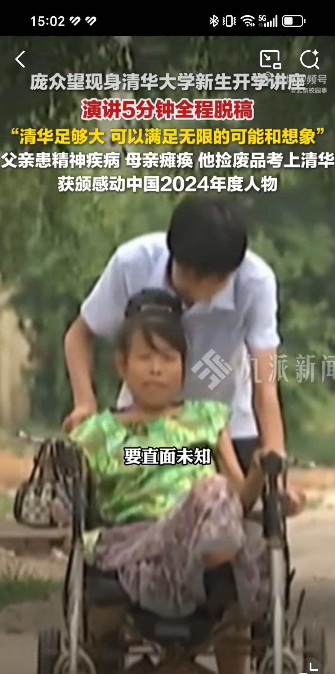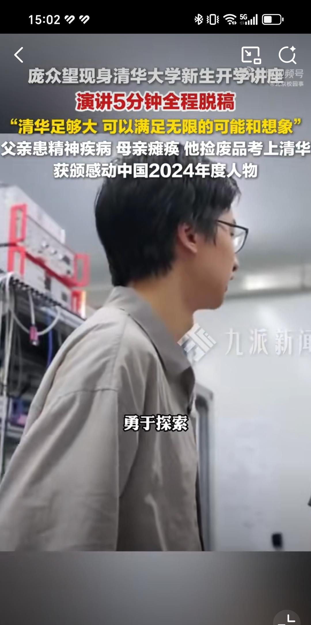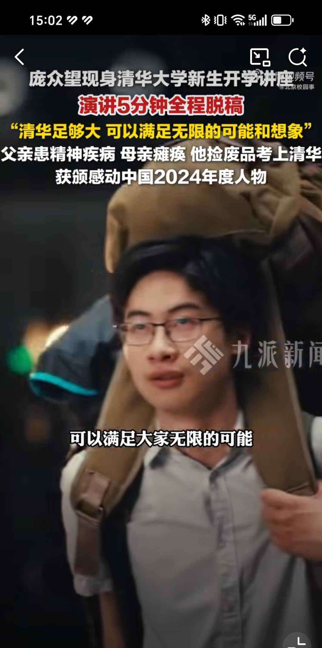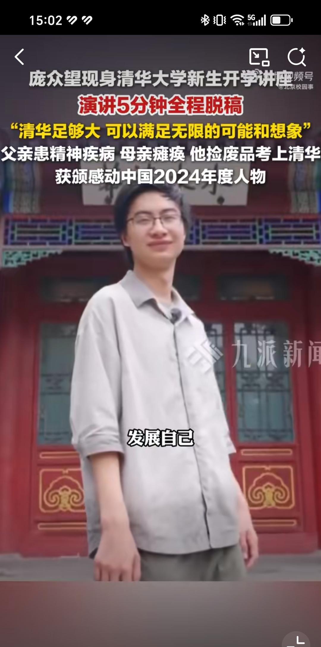 8月27日庞众望总是在一众人中让人注意到他的,这次庞众望在清华新生座谈会作为优秀学生代表发言。说实话没用稿子,自己一个人侃侃而谈,说的几句话我都能感受到清华大学的大和包容。 感觉庞众望就是一个时代农村人自强不息的一种代表,寒门贵子的具体化,很多寒门学习好的,却没有庞众望的心态和努力,就算有也很少有这样家庭还能支持自己走到这么优秀。 我以前感觉环境会让人变得优秀,其实自身基因占很大一部分,有的人天生就是很聪明,聪明到很多人遮不住他耀眼光芒,说的就是庞众望这样的寒门贵子,无论是生活苦难和幸福都能闯出不一样的路 希望清华的很多新生可以和师哥庞众望一样,好好学习报效祖国。