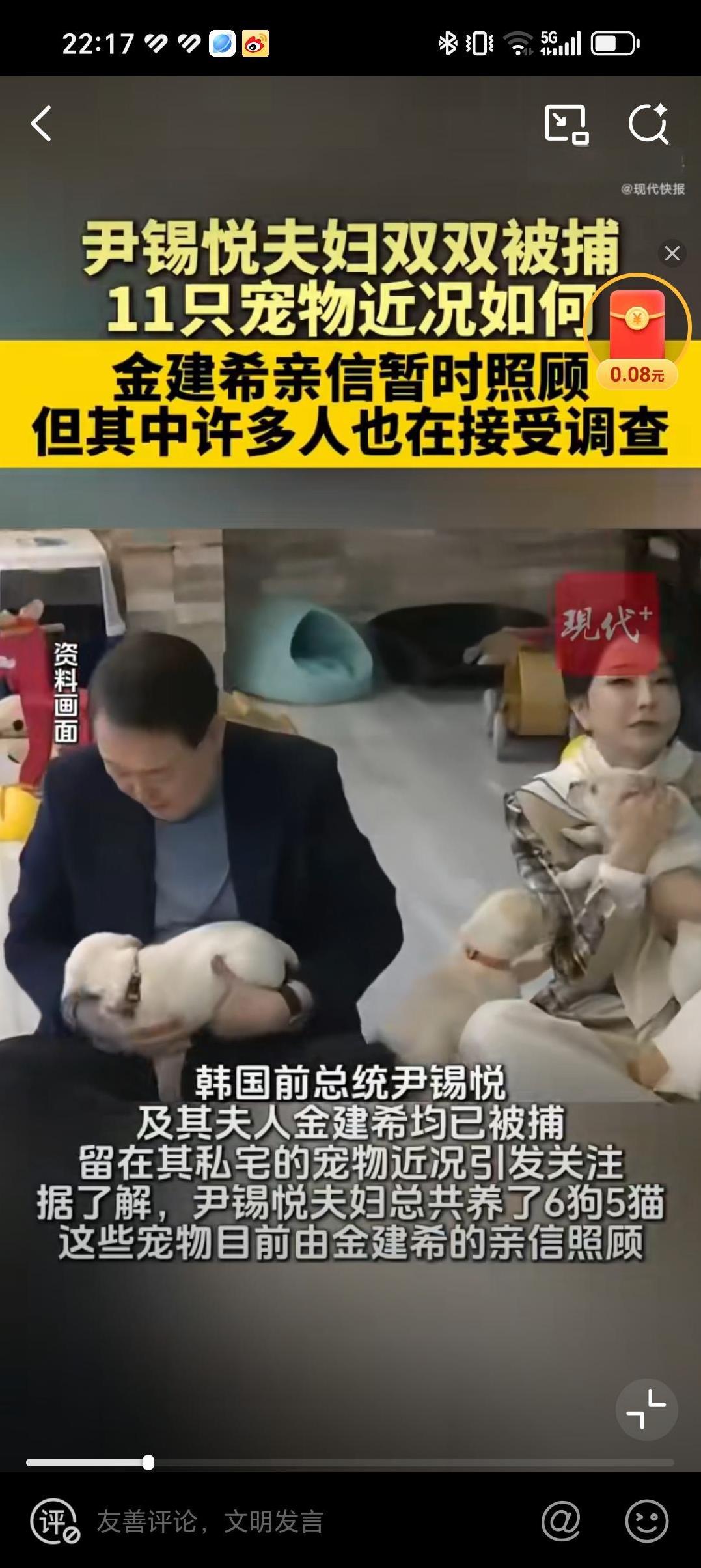 尹锡悦和金建希夫妻养了6狗和5猫,我只能说两人太闲了,自己每天喂食和清理都得很长时间吧!韩国总统不忙吗?还有时间照顾猫狗的,现在两个人被关押,这些猫狗还是亲信帮忙养着,说实话一只狗或是猫还可以理解,一群我是理解不了。 只能说金建希可能还是个比较喜欢小动物,善良的女人吧! 但是最后这结局,不知道金建希和老公尹锡悦有生之年可以在相见,一起生活吧!两个人还是很恩爱,没有孩子,一群猫狗,也是很与众不同了。 #头号创作者激励计划#