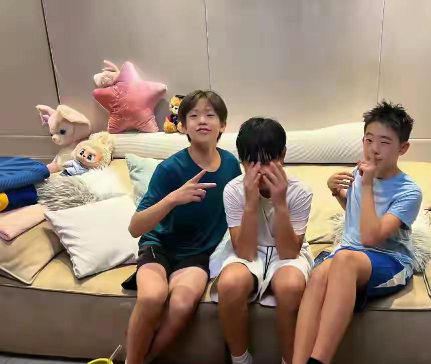 刘畊宏昨天晒的九宫格绝了!8月28日他没晒健身也没秀全家福,而是带着陈小春儿子Jasper、吴尊儿子Max和自家13岁的刘宇恩疯狂玩耍,三个娃从网球场打到卡丁车场,活力全开的样子简直让人移不开眼![点亮平安灯][比心] 照片里刘宇恩中分发型自带少年感,网友都说这颜值青出于蓝。Max白T白裤长刘海,秀气程度让女生都羡慕,Jasper寸头配套装,痞帅气质完美复刻陈小春。最逗的是仨孩子在沙发上各种搞怪,剪刀手、鬼脸全上阵,完全不顾及偶像包袱。其实这三家早因《爸爸去哪儿》结缘,孩子们从节目里的小豆丁长成现在的小少年,感情却一直没变。刘畊宏带他们运动时,Jasper连蹦床都能玩出花样,Max卡丁车漂移超稳,刘宇恩打篮球时的爆发力更是随了爸爸。这种从小培养的健康生活方式,才是给孩子最好的礼物吧![点亮平安灯][比心]