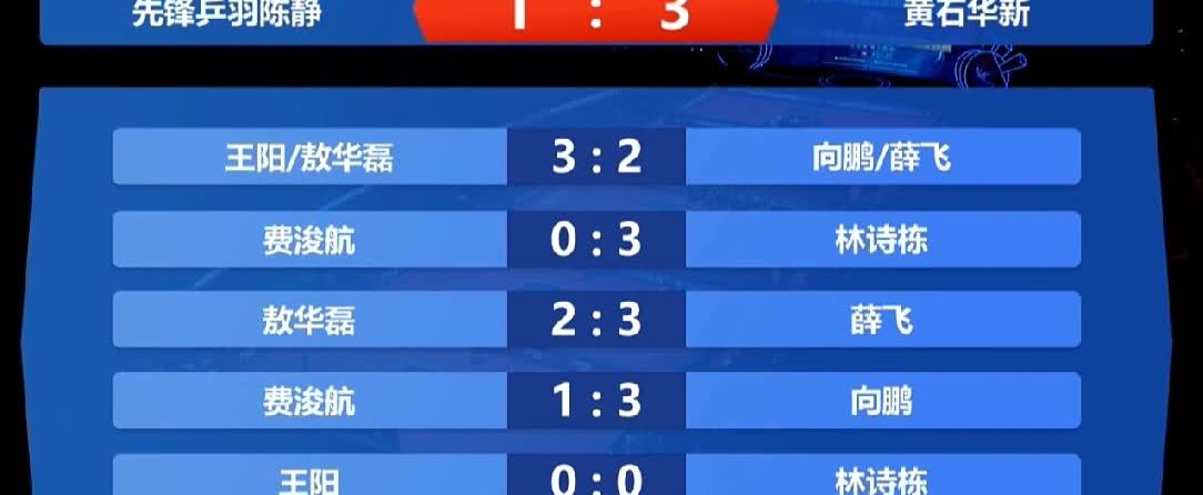 费浚航刚0-3输林诗栋,紧接着又1-3输向鹏。 就想知道费浚航昨天你是怎么赢的。 先是横扫的赵子豪,又把许昕气的不打比赛回家了。 竞技比赛真的有些看不懂,不会是上海地产没有樊振东坐阵,气场没那么强大家吧。 黄石华新今天也是大爆发,薜飞3-2敖华磊,林诗栋只打一盘就比赛就3-1结束了。 黄石华新乒超越来越好,在林诗栋带领下,不是最高配置,但已经稳定第二名,看今晚和山东魏桥的比赛,不管结局如何一定很精彩。 图片来自网络侵权可删。