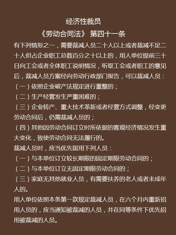 劳动合同法第41条(图5)有提到,经济性裁员时优先留用、6个月内重新招用人员的优先招用。