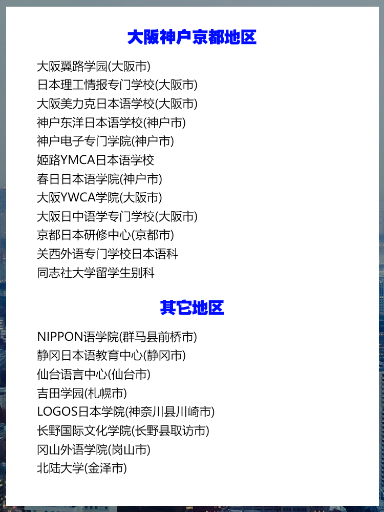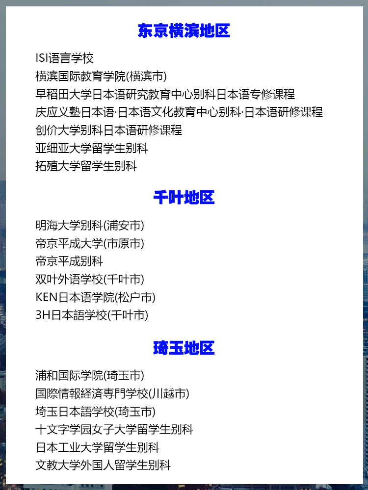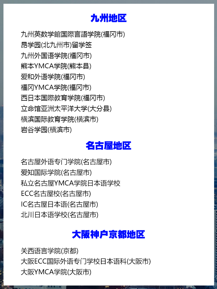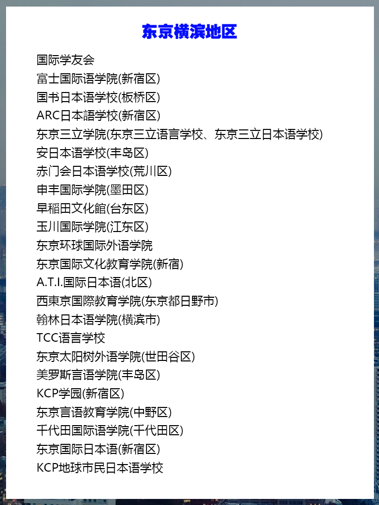 一、东京横滨地区 国际学友会 富士国际语学院(新宿区) 国书日本语学校(板桥区) ARC日本語学校(新宿区) 东京三立学院(东京三立语言学校、东京三立日本语学校) 安日本语学校(丰岛区) 赤门会日本语学校(荒川区) 申丰国际学院(墨田区) 早稲田文化館(台东区) 玉川国际学院(江东区) 东京环球国际外语学院 东京国际文化教育学院(新宿) A.T.I.国际日本语(北区) 西東京国際教育学院(东京都日野市) 翰林日本语学院(横滨市) TCC语言学校 东京太阳树外语学院(世田谷区) 美罗斯言语学院(丰岛区) KCP学园(新宿区) 东京言语教育学院(中野区) 千代田国际语学院(千代田区) 东京国际日本语(新宿区) KCP地球市民日本语学校 ISI语言学校 横滨国际教育学院(横滨市) 早稻田大学日本语研究教育中心别科日本语专修课程 庆应义塾日本语·日本语文化教育中心别科·日本语研修课程 创价大学别科日本语研修课程 亚细亚大学留学生别科 拓殖大学留学生别科 二、千叶地区 明海大学别科(浦安市) 帝京平成大学(市原市) 帝京平成别科 双叶外语学校(千叶市) KEN日本语学院(松户市) 3H日本語学校(千叶市) 三、琦玉地区 浦和国际学院(琦玉市) 国際情報経済専門学校(川越市) 埼玉日本語学校(琦玉市) 十文字学园女子大学留学生别科 日本工业大学留学生别科 文教大学外国人留学生别科 四、九州地区 九州英数学館国際言語学院(福冈市) 昂学园(北九州市)留学签 九州外国语学院(福冈市) 熊本YMCA学院(熊本县) 爱和外语学院(福冈市) 福冈YMCA学院(福冈市) 西日本国際教育学院(福冈市) 立命馆亚洲太平洋大学(大分县) 横滨国际教育学院(横滨市) 岩谷学园(横滨市) 五、名古屋地区 名古屋外语专门学院(名古屋市) 爱知国际学院(名古屋市) 私立名古屋YMCA学院日本语学校 ECC名古屋校(名古屋市) IC名古屋日本语(名古屋市) 北川日本语学校(名古屋市) 六、大阪神户京都地区 关西语言学院(京都) 大阪ECC国际外语专门学校日本语科(大阪市) 大阪YMCA学院(大阪市) 大阪翼路学园(大阪市) 日本理工情报专门学校(大阪市) 大阪美力克日本语学校(大阪市) 神户东洋日本语学校(神户市) 神户电子专门学院(神户市) 姬路YMCA日本语学校 春日日本语学院(神户市) 大阪YWCA学院(大阪市) 大阪日中语学专门学校(大阪市) 京都日本研修中心(京都市) 关西外语专门学校日本语科 同志社大学留学生别科 七、其它地区 NIPPON语学院(群马县前桥市) 静冈日本语教育中心(静冈市) 仙台语言中心(仙台市) 吉田学园(札幌市) LOGOS日本学院(神奈川县川崎市) 长野国际文化学院(长野县取访市) 冈山外语学院(岗山市) 北陆大学(金泽市)