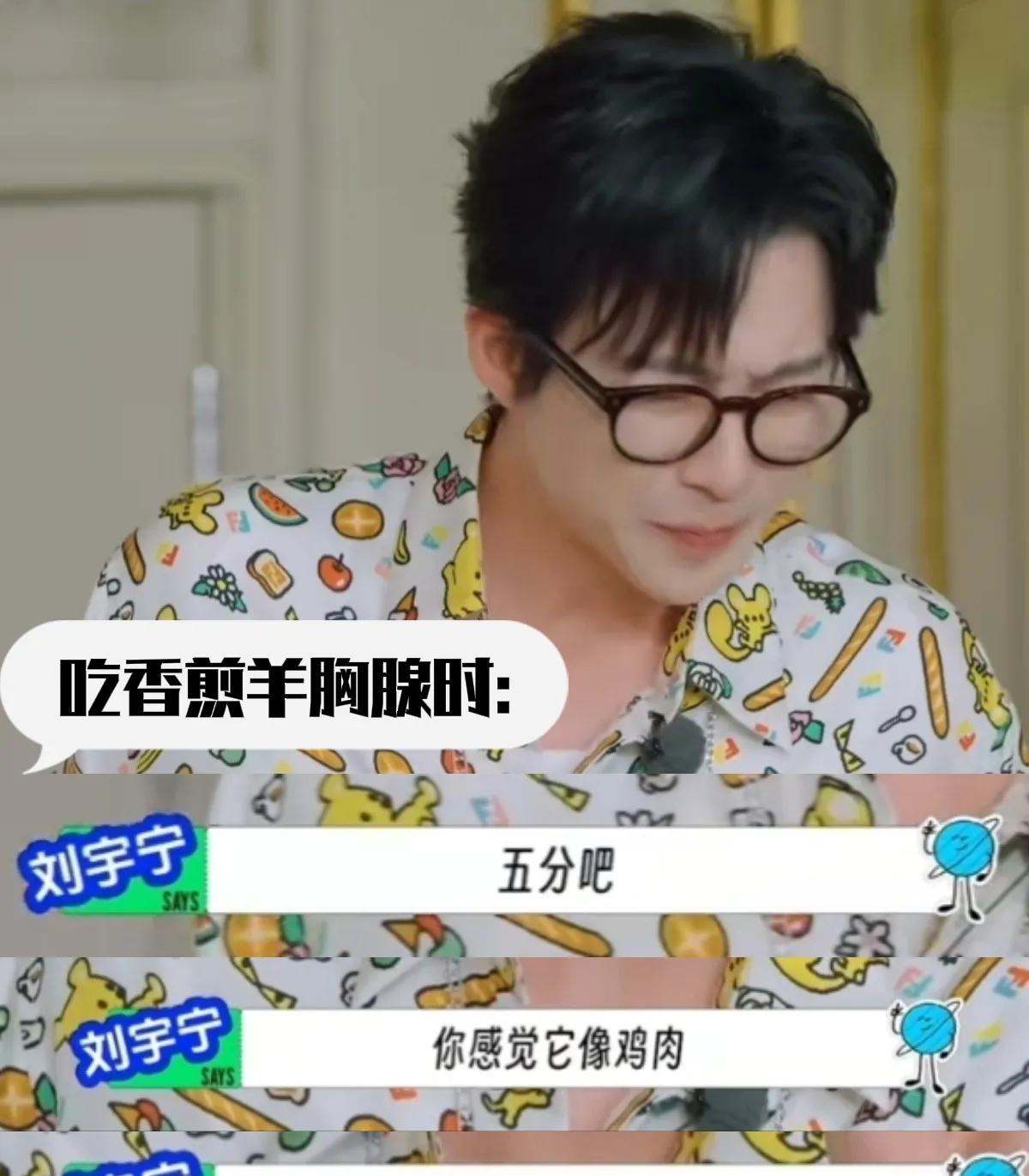 刘宇宁也太挑食了吧, 这不吃,那不吃,为什么要吃,没必要吃! 就说他还能吃点啥?东北大乱炖? 看了他不吃的那些东西, 其实都是一些外国菜和一些奇奇怪怪的菜, 比如羊小肠、羊胸腺、羊脑、羊奶酪, 这些膻味重,不爱吃也正常。 感觉他这次在国外录节目, 吃的真是样样不合胃口, 纯纯就是来“吃苦”的!