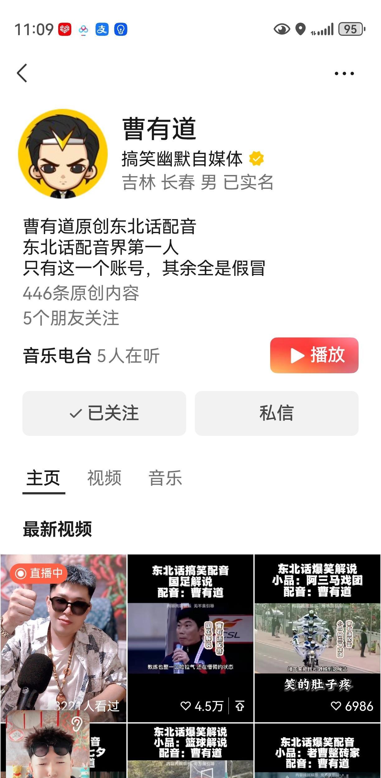 我从来不看直播,但唯独看曹有道的直播。刚看了他的直播,才见识了啥叫东北顶级段子手。 最初是从他的东北话搞笑配音认识他的。无论是配西游记、武侠剧,还是中国足球,风格夸张幽默,魔性洗脑,贼接地气,笑死人不偿命。 虽然有些言语听起来有点俗,但是他敢说真话,有些作品聚焦社会热点,讽刺不良现象,非常难能可贵。 曹有道是吉林德惠人,91年的,今年35岁,拥有69万粉丝。号称东北话配音第一人。东北话说的那叫地道,段子讲起来一套一套。 您看过他的东北话搞笑配音吗?如果没看过有点遗憾哦,强烈推荐!