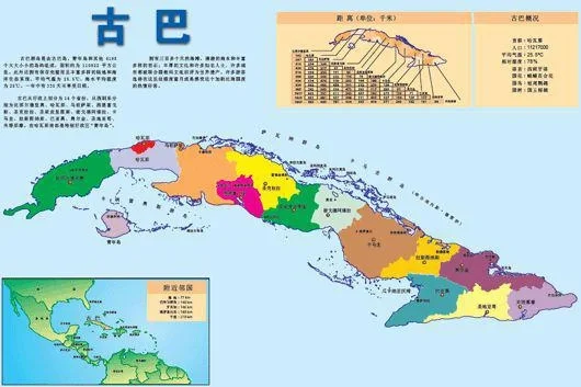 [一R]古巴地形整体以平原为主,西北、中部和东南有较大的地形起伏区,主要为较平缓的丘陵、低山。其中南部有主要的马埃斯特腊山。该国为热带气候,东南部为热带雨林气候,中部和西部为热带草原气候,年平均气温为25摄氏度。由于陆地狭长分布,所以河流短小,无大江大河,主要河流为考托河。古巴人口约有1121万,白人占66%,其余为混血人种和黑人等。官方语言为西班牙语,首都位于该国北部沿海的哈瓦那,主要中部城市圣克拉拉,南部沿海城市圣地亚哥等。蔗糖业是该国国民经济的基础,是世界上主要产糖国家之一,并且是世界上人均产糖最多和出口糖最多的国家;金属矿产以铜、锰、镍、铬为主;哈瓦那为该国最大的港口。