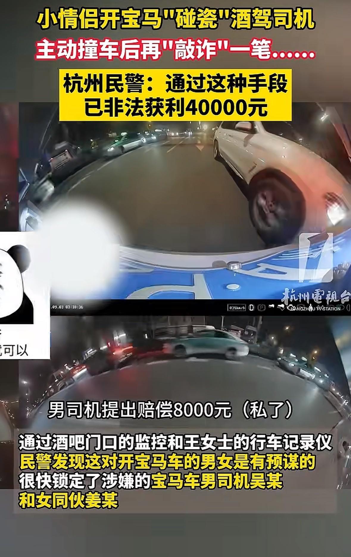 浙江杭州,女子深夜从酒吧出来后,思虑再三还是选择开车回家,在路口时被一辆宝马车追尾。女子下车跟对方理论,岂料宝马车主指出女子喝酒要报警。女子提出私了,对方索要赔偿8000元,女子只能照单全收。等女子醒来后觉得不对劲,查看行车记录仪发现问题,自己报了警。 王女士在9月2日跟朋友约了晚饭,吃完饭后想再玩一会,一行人就去了酒吧消遣,直到半夜才结束。 9月3日的凌晨,王女士从酒吧出来后,伙伴们都各自回了家,她就开始纠结到底要怎样回家? 吃晚饭的地点比较远,她就开车来的,但是没想到后来还会去酒吧,所以也就只能把车开到了酒吧。 但是王女士知道自己开了车,所以也没敢多喝,都是意思一下喝了几口而已。也就是因为只喝了几口,所以王女士才在想到底要不要自己开车回家,毕竟已经是深夜。 在车里纠结了好一会,然后王女士下了车,打开车门坐到了主驾驶的位置,然后一脚油门将车开走。 王女士一路上都在担惊受怕,生怕遇到检查的,车速还不敢开太快,怕自己控制不了出意外。 就是这么战战兢兢的开着车,还是没能躲过意外的来临,在路口的时候被一辆宝马车给追尾了。 王女士赶紧下车跟对方理论起来,对方车子下来一男一女,一句话不说,就听着王女士叫嚣。 等王女士不说话了,宝马车主的男子开口说了句:你喝酒了,报警吧! 王女士一听这话吓得脸都白了,自己的确是喝酒了,但是喝的不多,对方怎么就闻出来了呢? 本来就心虚,这下王女士更是不敢再叫嚣,马上软了下来,表示可以私下处理这事,没必要非要报警处理。 宝马车主看到王女士的态度变了,也表示可以不报警,但是王女士得赔偿8000元。 王女士想都没想,赶紧转账支付了8000元。宝马车主收到钱就开车走了,王女士也赶紧回了家。 等王女士彻底清醒后,回想起凌晨发生的事情,越想越不对劲,好像自己被敲诈了一样,于是赶紧去查询行车记录仪。 王女士越看越生气,看完后竟然自己跑去了派出所,把行车记录仪交给民警看。 原来从王女士的行车记录仪里可以看出,宝马车是一路跟在王女士的车后,从酒吧开始一直到路口。 民警也觉得这件事蹊跷,调取了酒吧附近的监控录像,还原了整件事的原委。 宝马车一直停在酒吧附近,在王女士从车上下车再到驾驶室开车的过程中,宝马车主是从远处观察了好一阵子才回到宝马车上开车尾随的,很明显这是一起精心策划的故意追尾。 民警马上锁定了宝马车,依法传唤当天驾驶宝马车的男子吴某,以及副驾驶姜某到派出所进行调查。 吴某很快承认跟姜某是男女朋友关系,两个人经常在酒吧门口物色可制造事故的车辆,王女士的车辆就是其中一个。 因从酒吧出来的人大部分都有侥幸心理,就是因为这份侥幸心理才给了吴某和其女友机会。 两个人从2025年6月起,就已经通过制造事故从而实施敲诈勒索了3次,非法获利4万元。 吴某表示,即便是自己追尾上去,但是对方看到吴某开的是豪车,而且对方肯定是喝了酒的情况下,就一定不会选择报警处理,这样才能得到更高的赔偿。 也就是为了得到更多的赔偿,吴某才买了这辆宝马车。 根据《刑法》第274条的规定:敲诈勒索公私财物,数额较大或者多次敲诈勒索的,处三年以下有期徒刑、拘役或者管制,并处或者单处罚金;数额巨大或者有其他严重情节的,处三年以上十年以下有期徒刑,并处罚金;数额特别巨大或者有其他特别严重情节的,处十年以上有期徒刑,并处罚金。 吴某跟姜某以故意制造剐蹭事故实施敲诈勒索的行为,已经触犯了相关的法律规定,民警以依法将二人刑拘。 而至于王女士自己,虽然被敲诈勒索很值得同情,但是要不是王女士自身存在问题,也不会让对方钻了空子。 根据《道路交通安全法》第91条的规定:饮酒后驾驶机动车的,处暂扣六个月机动车驾驶证,并处一千元以上二千元以下罚款。 醉酒驾驶机动车的,由公安机关交通管理部门约束至酒醒,吊销机动车驾驶证,依法追究刑事责任;五年内不得重新取得机动车驾驶证。 王女士的确是酒后驾驶的机动车上路行驶,民警已经将王女士的酒驾违法行为交由交警部门处理。 开车不喝酒,喝酒不开车。无论是司机还是普通人,都应该牢牢记住这句话,可以在关键时刻提醒自己,也提醒身边的家人和朋友。 王女士之所以会被有心人钻了空子,也是自己的法律意识不强,存在侥幸心理,反而损失的更多。 希望王女士可以通过这件事得到教训,哪怕只是喝了一口酒,都不要自己开车,或者打车回家,或者叫代驾回家。无论选择哪种,都不能选择自己开车回家。
