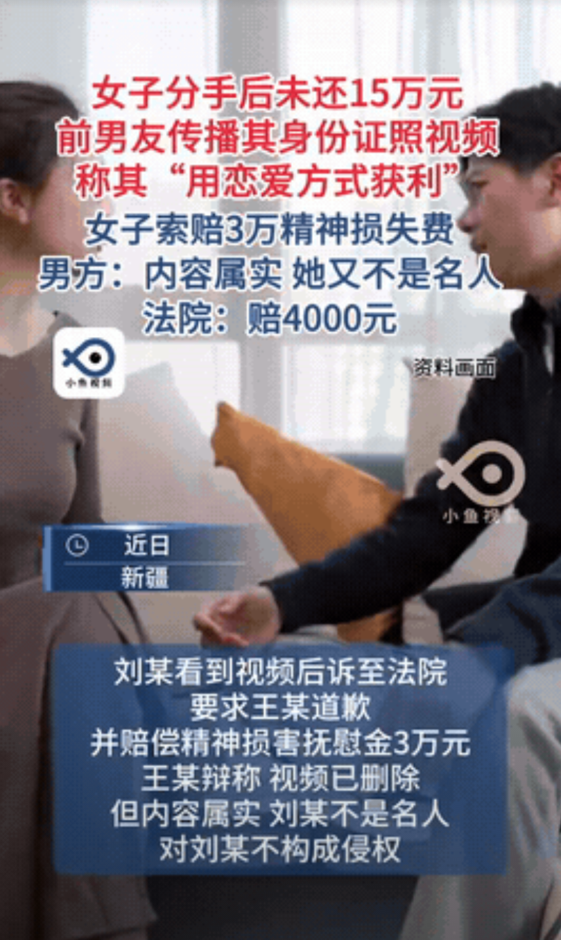 “这种报复不可取!”9日报道,新疆一男子和前女友分手,他要求前女友归还恋爱期间的转账15万元。在遭到拒绝后,男子决心对其进行报复,他写了一篇前女友以“用恋爱方式获利”的文章,搭配着前女友身份证照片做成视频,在网络上传播,前女友发现后,以男子侵犯其名誉隐私为由,将男子告上法庭,并索赔精神损失费3万元,法院判了!