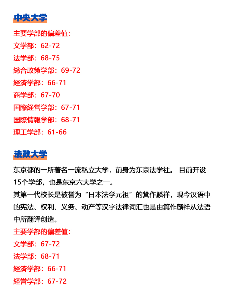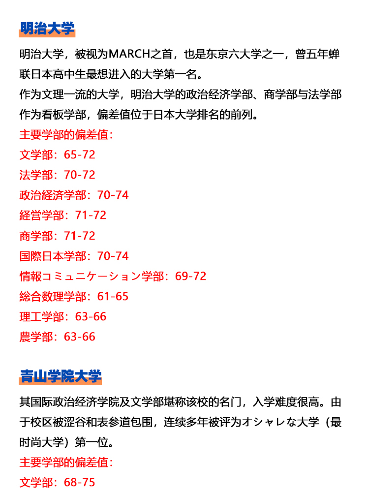 明治大学 主要学部的偏差值: 文学部:65-72 法学部:70-72 政治経済学部:70-74 経営学部:71-72 商学部:71-72 国際日本学部:70-74 情報コミュニケーション学部:69-72 総合数理学部:61-65 理工学部:63-66 農学部:63-66 青山学院大学 主要学部的偏差值: 文学部:68-75 総合文化政策学部:70-74 法学部:70-72 国際政治経済学部:70-74 経済学部:68-71 経営学部:71-72 社会情報学部:67-74 コミュニティ人間科学部:66-69 教育人間科学部:71-73 地球社会共生学部:69-71 理工学部:58-66 立教大学 主要学部的偏差值: 文学部:64-72 スポーツウエルネス学部:64-68(2023年4月開設) 現代心理学部:65-72 法学部:69-72 経済学部:68-72 経営学部:70-74 社会学部:69-74 観光学部:68-71 コミュニティ福祉学部:64-69 異文化コミュニケーション学部:72-75 理学部:63-66 中央大学 主要学部的偏差值: 文学部:62-72 法学部:68-75 総合政策学部:69-72 経済学部:66-71 商学部:67-70 国際経営学部:67-71 国際情報学部:68-71 理工学部:61-66 法政大学 主要学部的偏差值: 文学部:67-72 法学部:68-71 経済学部:66-71 経営学部:67-72 社会学部:67-71 現代福祉学部:64-70 国際文化学部:71-74 人間環境学部:67-69 情報科学部:59-61 キャリアデザイン学部:68-72 グローバル教養学部:69-74 デザイン工学部:59-65 理工学部:57-62 スポーツ健康学部:67-69 生命科学部:58-63