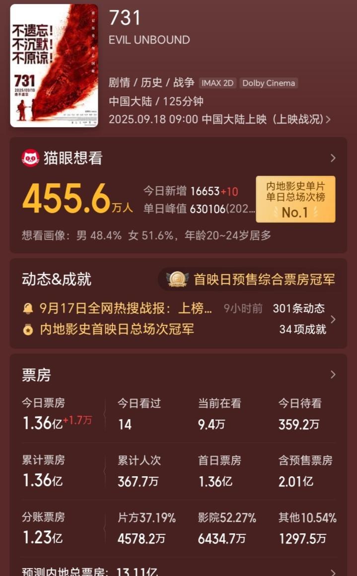 有人说《731》票房会过100亿! 我说能过30亿就谢天谢地了! 电影《731》今天正式上映了。这部电影呼声很高,因为前面改档风波,造成热度越来越高,加上民族情绪,网络上有人说,这部电影票房会突破100亿,甚至说会超过《哪吒2》! 说这些话的人,要么是情绪激动,要么就是完全不懂电影。 现在不是几年前了,现在整个大环境不好,有闲钱去看电影的人,远不如以前。另外虽然《731》是爱国电影,但是也有一些人并不喜欢这类题材! 我看了下猫眼的预测,也只有13.11亿,这个预测是根据院线排片、预售、上座率等数据来预测的,相对来说比较专业。虽然到时候会有一些变化,但是差别不会很大。这也说明了我的预测并没有错! 你觉得《731》最后票房大概会到多少呢?#731大电影#