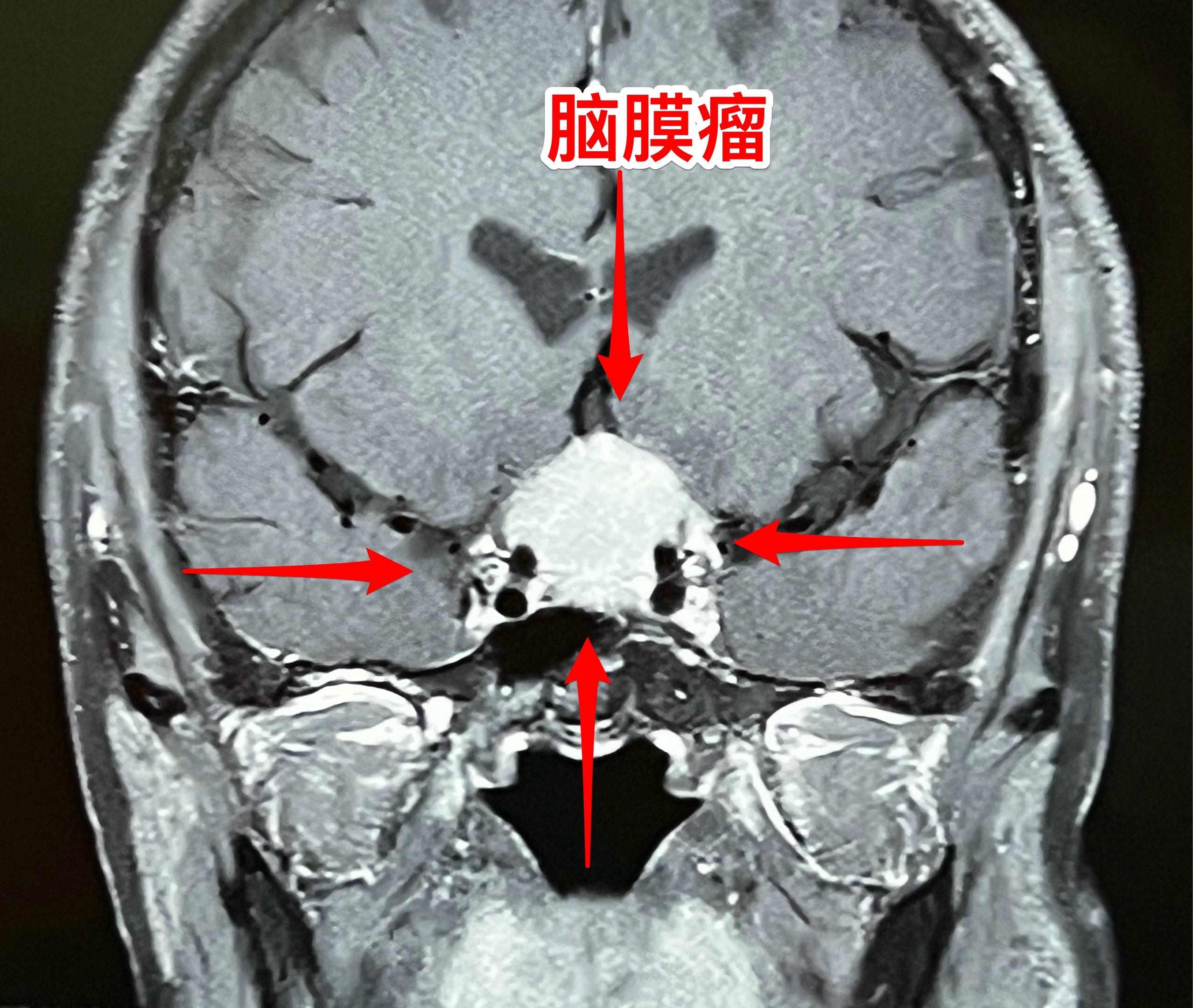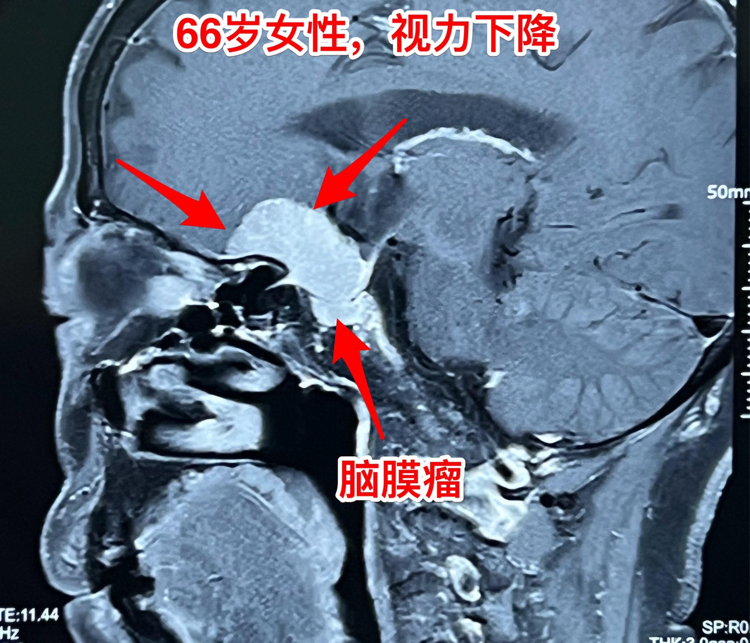 今年她感觉视力明显下降,开车有困难。作了磁共振发现鞍区脑膜瘤,见图。