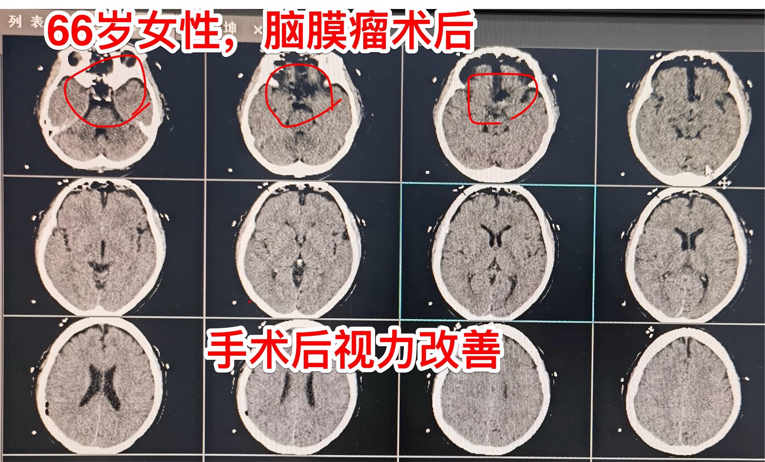 脑膜瘤属于良性肿瘤,作手术切除肿瘤是最合适的治疗方法。9月16日作了开颅手术,将肿瘤完全切除。手术后病人感视力有改善。脑膜瘤视力下降