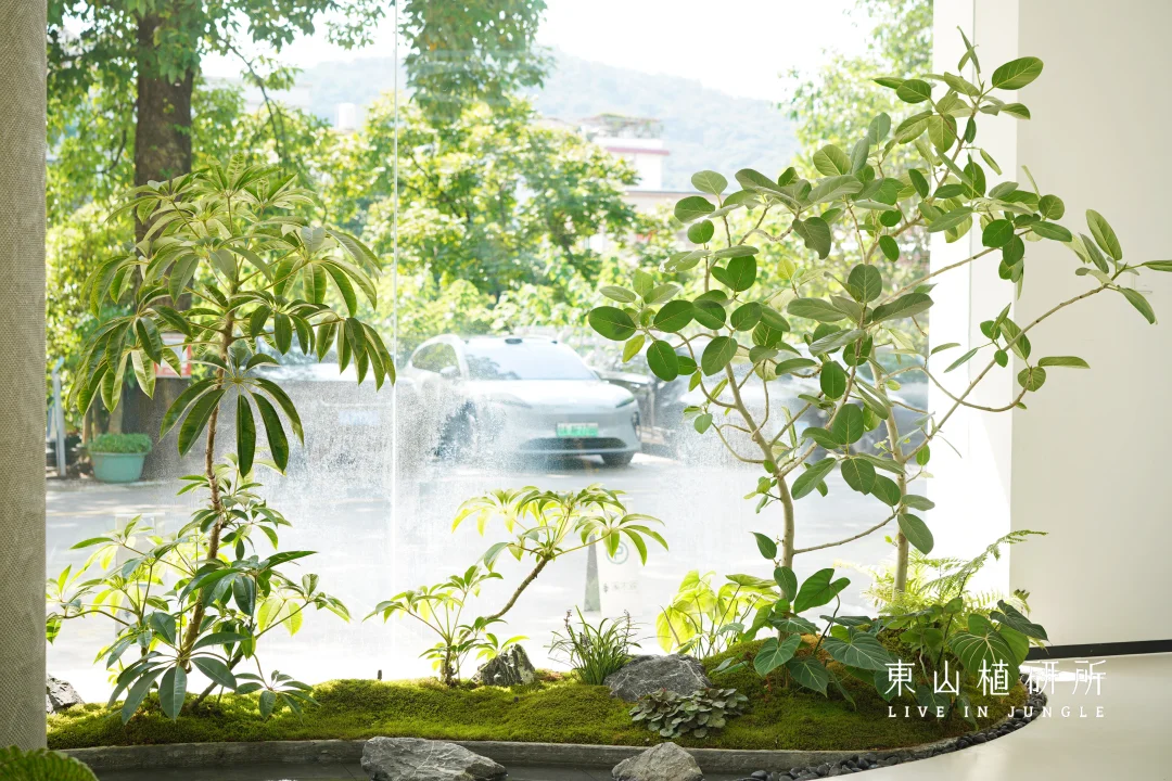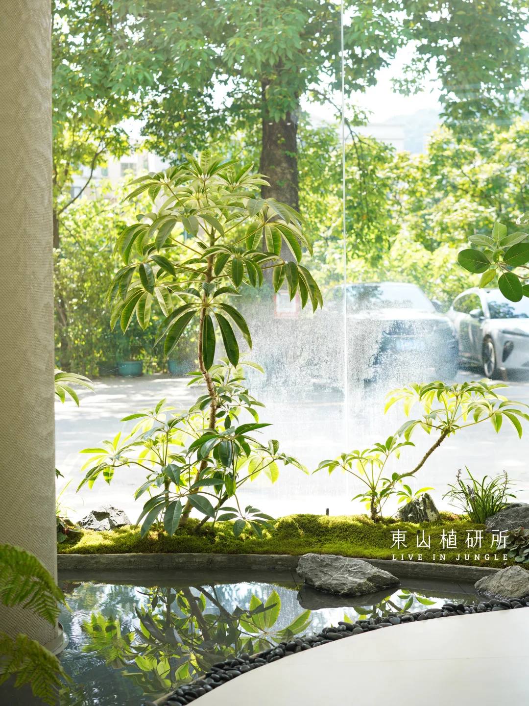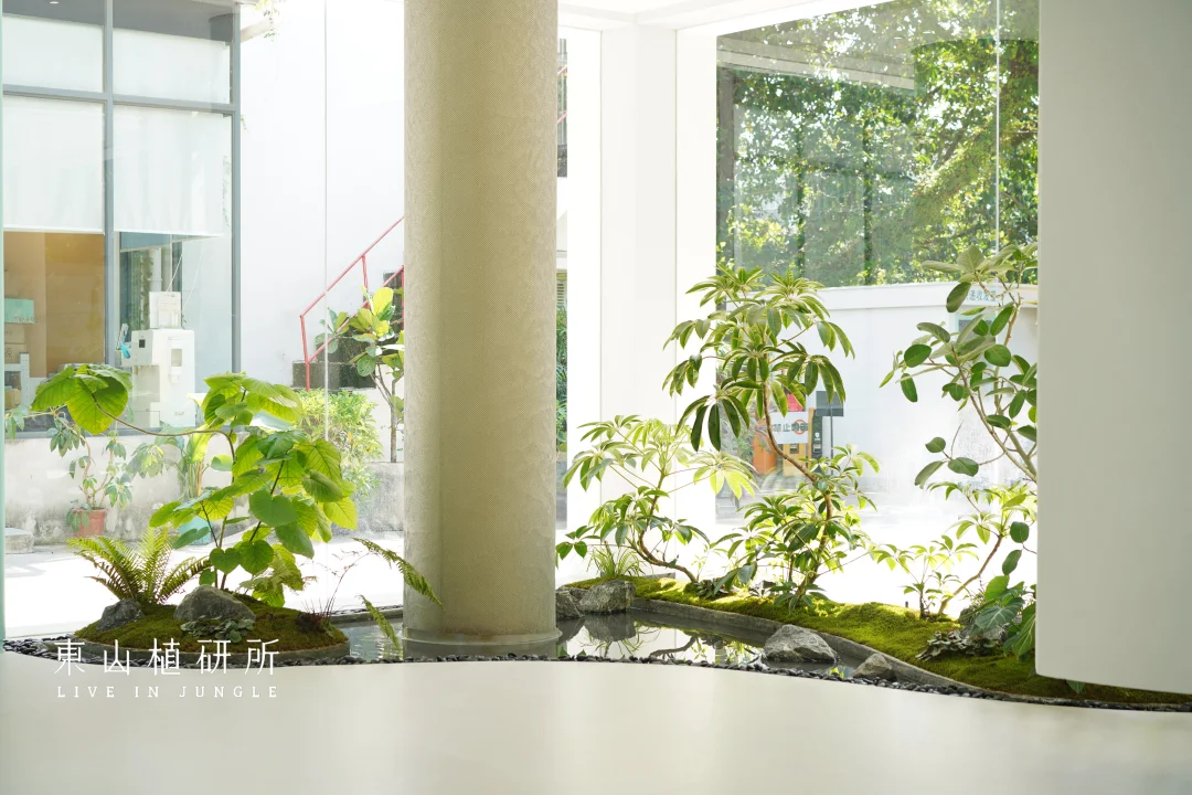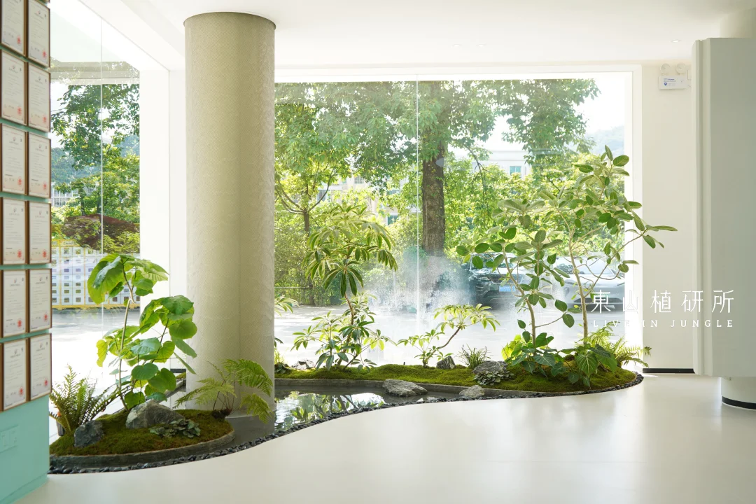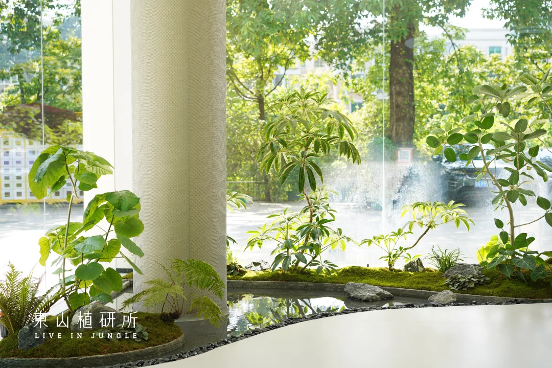 室内绿植设计 由绿植、流水、石头构筑的绿植池 是繁忙生活里的疗愈绿洲 澄澈的玻璃将外界的光线与室内的绿意衔接 苔藓如绒毯轻覆石间,阳光投下灵动光斑与树影 池水似明镜,倒映着叶姿 把自然的绿意与空间的简约 揉成一首疗愈的诗 ————