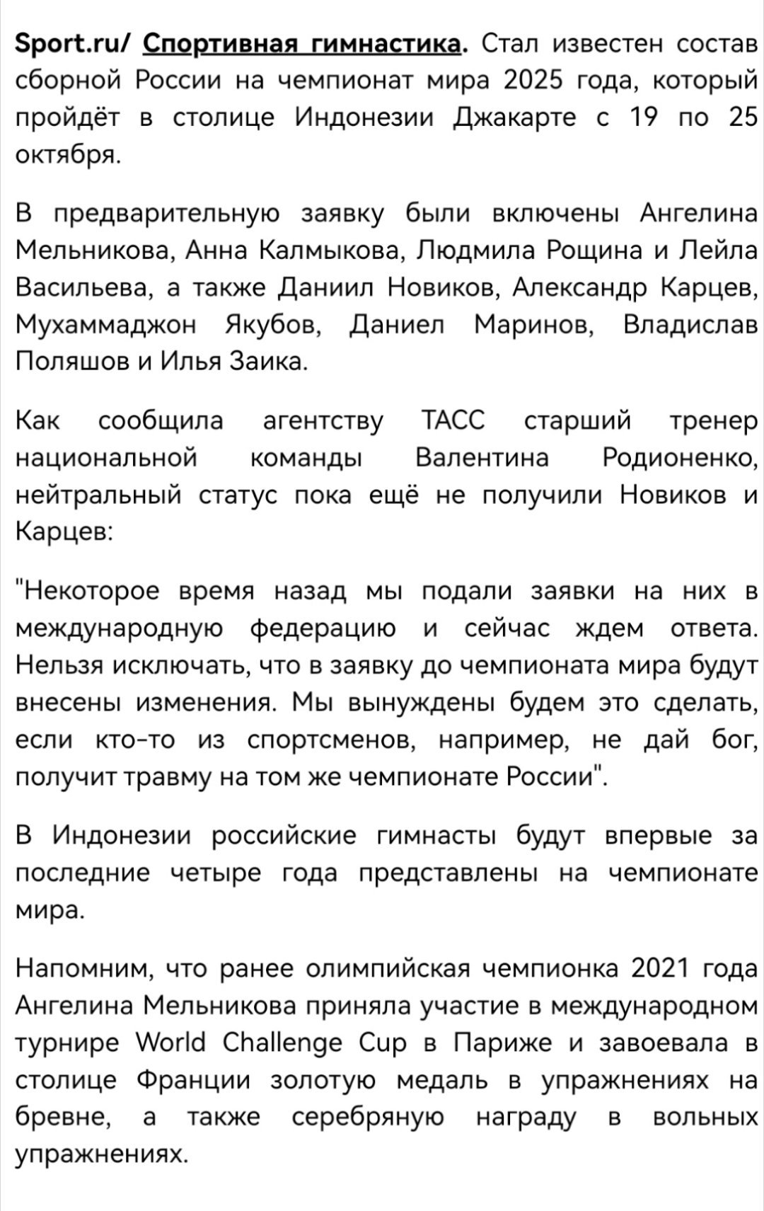 女队:Angelina Melnikova, Anna Kalmykova, Lyudmila Roschina, Leila Vasilyeva(全能资格尚未确定)