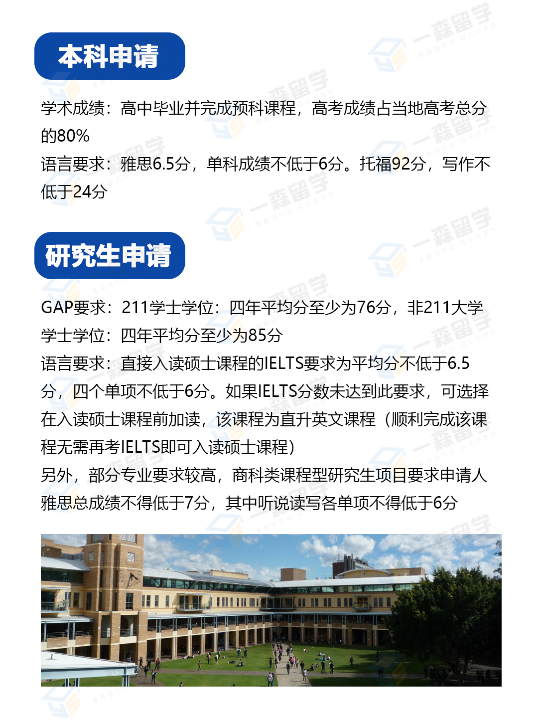 本科申请 申请条件 学历要求:完成泰勒学院预科,GPA达到6.9以上,或者以中国高考成绩申请且至少超过当地的一本线 英语要求:最低要求雅思6.5分,每门不低于6.0分 其他专业:农业,设计,规划,商科,工程,IT要求雅思7.0,单科不低于6.0 理学,营养和饮食:雅思7.0,单科不低于6.5 言语病理学、护理、兽医:雅思7.0,单科不低于7.0 传媒和法律:雅思7.5,单科不低于7.0 教育学:雅思7.5,且阅读,写作不低于7.0,听力,口语不低于8.0 申请材料 护照原件及复印件、照片(6张2寸白底彩照)、全家人身份证原件及复印件、全家人户口本复印件、语言成绩单复印件 对于尚未毕业的学生:大学在读证明公证、大学成绩单公证 对于已经毕业的学生:毕业证公证、学位证公证、成绩单公证、工作证明/实习证明(空档期不能超过三个月)、个人陈述(根据不同学校要求,Melbourne商科需要,设计类需要)、教授推荐信、学位证、毕业证、成绩单的清华认证(申请悉尼大学的学生需要提供)、gre成绩(根据不同学校要求)、gmat成绩(根据不同学校要求)、荣誉证书。 研究生申请 学术条件:获得悉尼大学认可的三年制本科学士学位或同等学历,部分专业要求获得荣誉学位,平均分要求达到65%及以上。Business商业领域要求211院校学生均分达到75%,双非院校学生均分达到87%。 语言条件:大部分课程要求雅思总分达到7.0分、单项不低于6.0分。部分课程如工程与计算机科学、健康科学、医学类、法学和商学类,雅思总分要求7.0分、单项不低于6.5-7.0分,教育类课程雅思总分高达7.5分。 其他条件:部分专业如Architecture、design and planning建筑、设计和规划领域必须提供工作或相关实践经验;MBA要求有3年管理工作经验;法学部分课程要求有2年相关专业工作经验证明;商科类课程大多需要提供GAMT或GRE成绩;设计、建筑、音乐等课程有作品集要求;护理课程需要面试;教育、医学和兽医科学等专业还有其他额外要求。