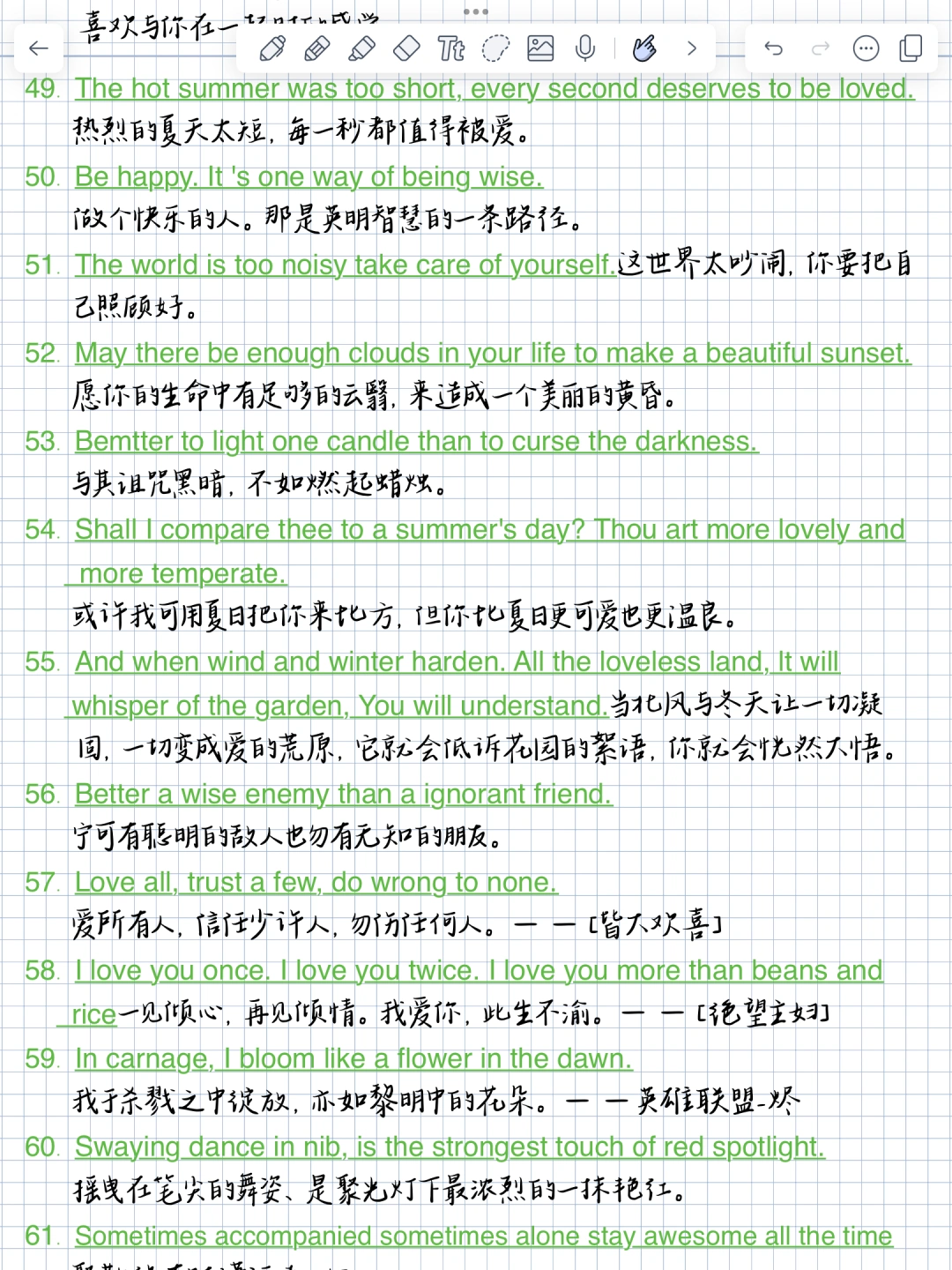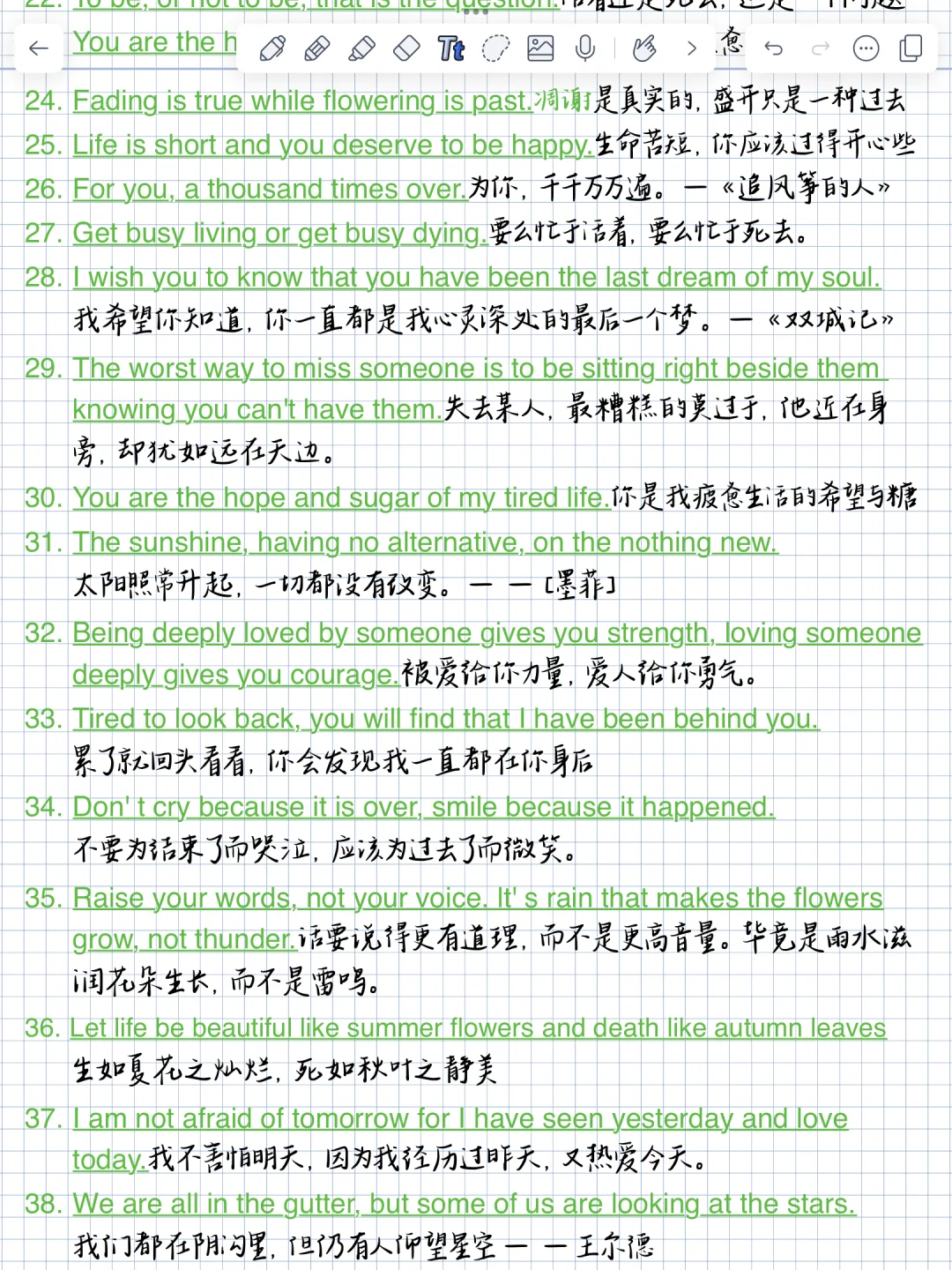1. Meet you like the wind.遇见你,温澜如风。 2. Live long and prosper.生生不息,繁荣昌盛。 3. And forever has no end.永永远远,永无止境。 4. There is always a better way.总有更好的办法。 5. Better be your own universe.不如做自己的宇宙。 6. The longest day has an end.最难过的日子也有尽头。 7. No pains, no gains.一分耕耘,一分收获/不劳则无获! 8. I met you dead wood for spring.我遇见你,枯木逢春。 9. You are gentle with the sun set glow.你与霞光共温柔。 10. We all meet better ourselves.我们终将遇见更好的自己。 11. Born sensitive, lonely and happy.生而敏感,孤独而快乐。 12. May everything you meet be gentle原你所遇皆是温柔。 13. Whatever you do, do not let go!不管你做什么,都不要放弃! 14. We will go ashore in the sunshine.我们终将上岸阳光万里。 15. My journey is the stars and the sea.我的征途是星辰大海。