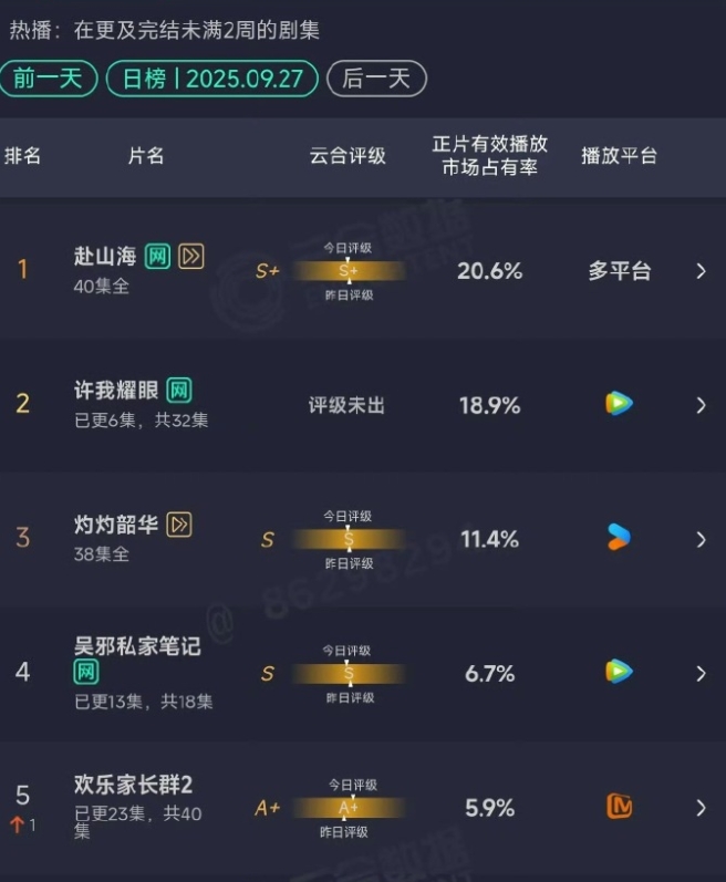 开播第二天云合占比就18.9%了,主要还是《赴山海》不给力,明天就要被《许我耀眼》给超越了,一部是砸钱疯狂营销的双平台大制作,另一部也曾是大制作,但是现在没什么宣传,赵露思自己也没宣传,人家剧播没带她,她也没必要浪费这个营销费,这部剧即将东方卫视上星播出。