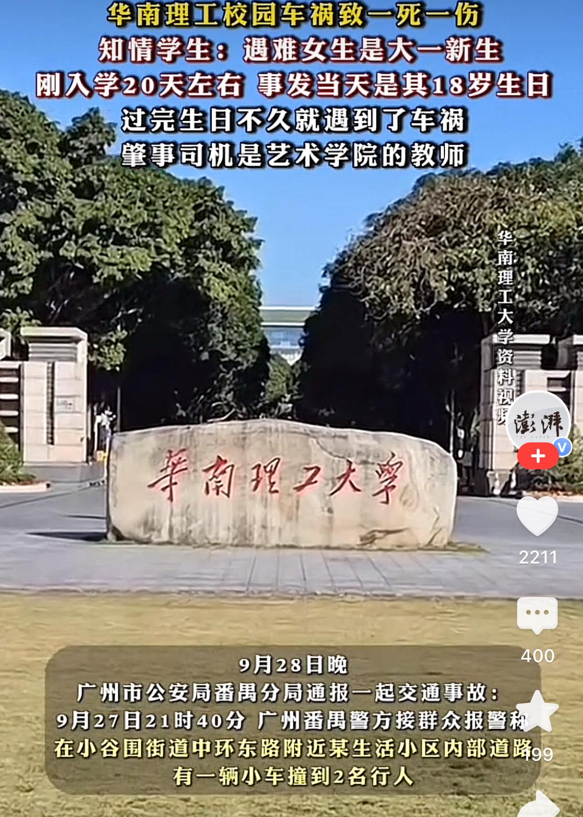 意外和明天不知道哪个先来, 一大早看到华南理工大的车祸, 太难受了,受不了! 看到新闻说撞死的那个学生是大一新生陆某,刚入学20天的小姑娘,而且是刚过完18岁的生日,还没来得及好好的享受大学的时光呢。 和她一起的同伴受伤了,她说陆某还竞选上了班长,特别的优秀的一个人。 就这样被一个醉酒驾驶的老师给撞没了,太可惜了,太可惜了。 这个老师太没有师德了,醉酒了还要开车!必须严查严惩!