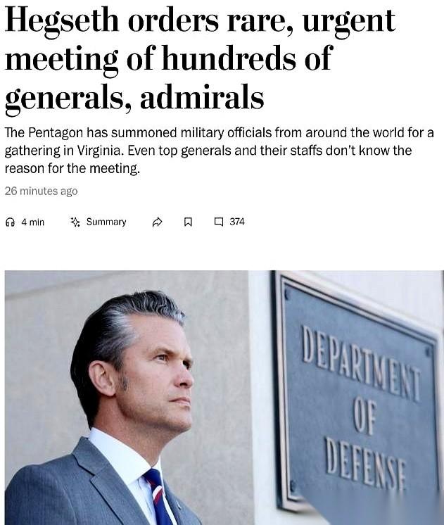 美国新上任的“战争部长”,一嗓子把全球美军800多个将军,全叫回了老家开会。 就,一锅端。 管你是在欧洲盯着俄罗斯,还是在亚太调动航母,全都得放下手里的活儿,坐十几个小时飞机赶回去。关键是,去干嘛,没人知道。将军们在飞机上互相发短信打听,跟被老师叫到办公室前对口风的小学生一模一样。 这事儿太反常了。 放着好好的加密视频会议不用,非要把所有“大脑”都凑到一个篮子里,这风险大到离谱。这哪是开会,这摆明了就是一场秀。 说白了,新官上任三把火。这位新部长,之前就已经裁了一批将军,现在把剩下的人全叫到跟前,意思很明显: 要么,是当面宣布第二波裁员名单,顺便看看谁的脸色最难看。 要么,就是一场赤裸裸的“服从性测试”。看看谁敢不来,谁敢有怨言。来了,也得站直了听他一个人训话,让他享受一下“君临天下”的感觉。 这根本不是什么军事会议,这就是一场职场大换血的动员会。主题不是“怎么打仗”,而是“以后谁说了算”。 平日里一个个在自己战区里呼风唤雨的“土皇帝”,现在全成了等着被新老板“审阅”的PPT。 这比任何一场真枪实弹的冲突,都更让人觉得,山雨欲来风满楼。