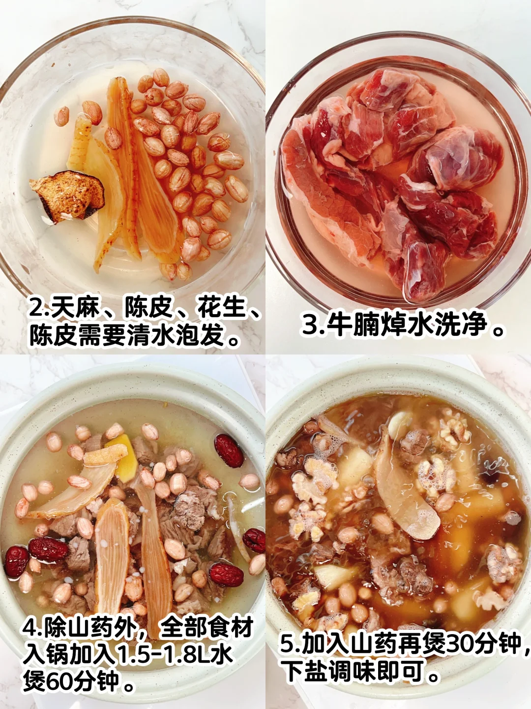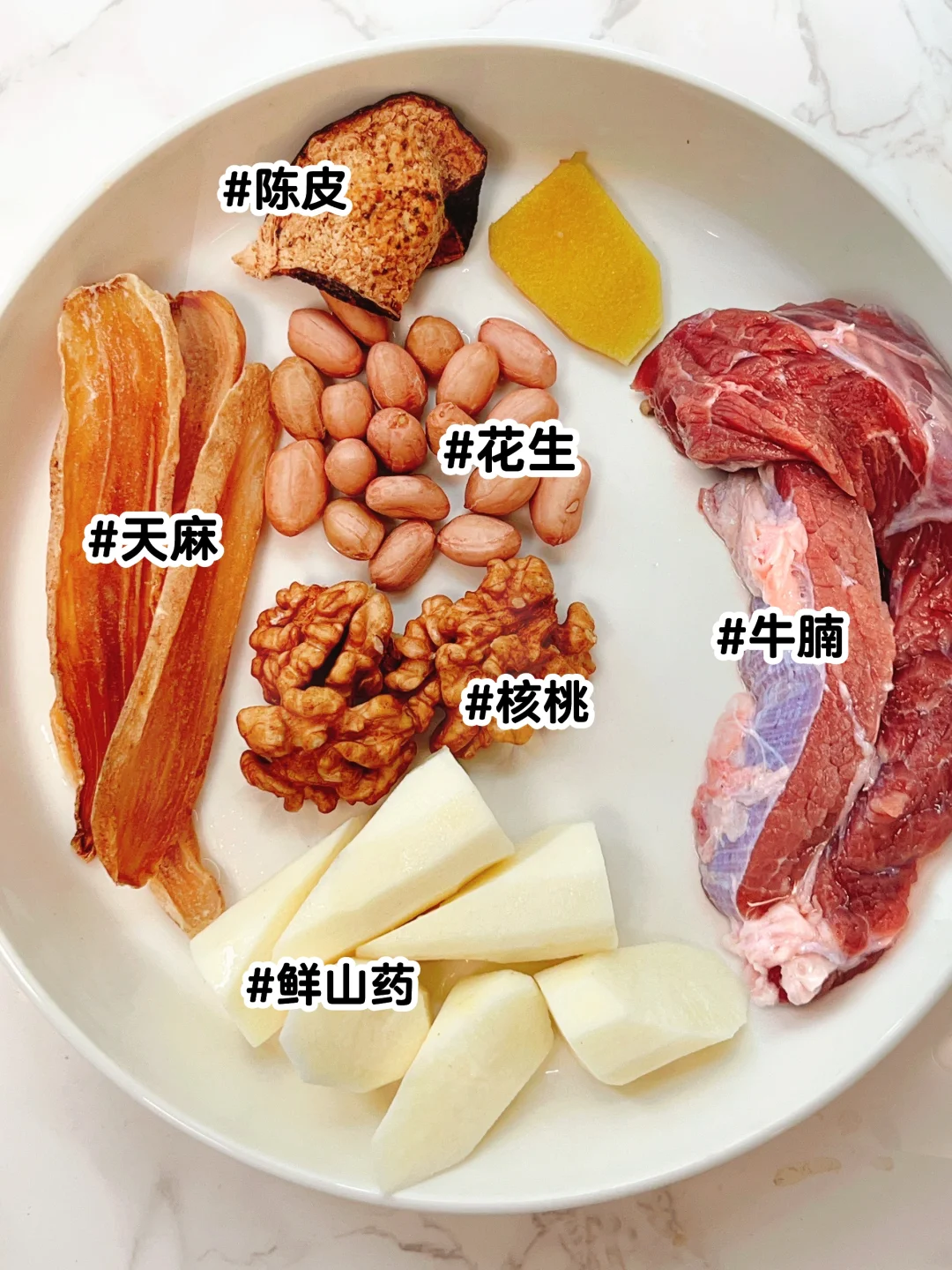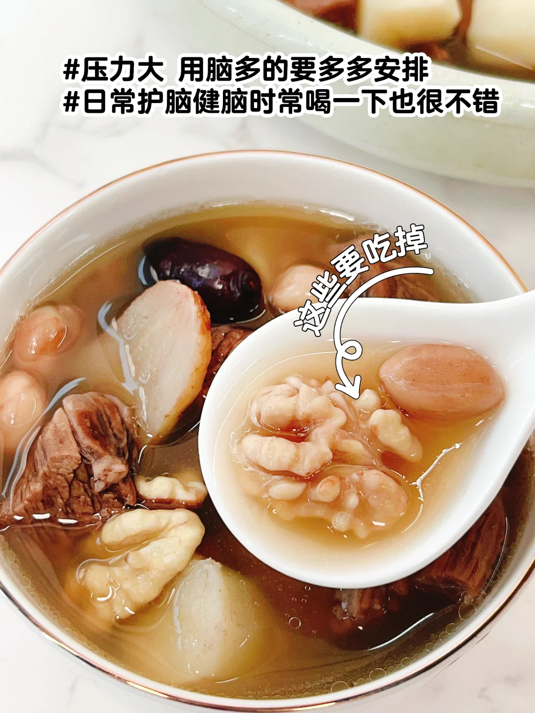 经常熬夜用脑🧠过度 如果开始出现▪️经常头痛🤕️、▪️对事情不起兴趣🫠、▪️感觉脑袋不够用😵‍💫漏东漏西、▪️半夜焦虑难受压力大😫、▪️上班不自觉摸鱼🐟。证明你的大脑已经很累了😮‍💨。 但由于作息不规律和饮食不正常,⭕️大脑无法好好的自然补充,这香浓美味的补脑汤一定要开始安排,日常煲给大人小孩老人家健脑也很不错。 ◾️——食材: ▪️天麻15g▪️核桃仁4-5颗▪️花生30g ▪️鲜山药100g▪️陈皮1瓣▪️牛腩400-500g ▪️红枣5颗▪️姜片 ⭕️牛肉:肉类补脑王丰富的锌、铁、vb ⭕️天麻、核桃花生:通络、增加脑活力 ⭕️山药、陈皮:健脾益气,促进汤的营养吸收 ◾️——做法: [一R]核桃躯壳剥衣。 (·核桃 蒸或水煮 (水沸腾后)3-5分钟,核桃仁可整颗轻松取出。 · 核桃仁用热水泡3分钟后泡一下冷水,核桃衣非常容易剥掉。⭕️核桃衣虽然有营养,但就那么一点核桃衣,营养成分不足为提,而且苦涩还影响汤味) [二R]天麻、陈皮、花生、陈皮需要清水泡发。 [三R]牛腩焯水洗净。 [四R]除山药外,全部食材入锅,加入1.5-1.8L水煲60分钟。 [五R]加入山药再煲30分钟,下盐调味即可。