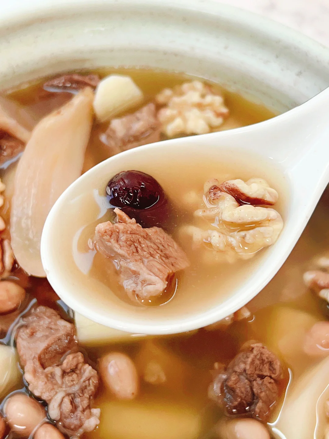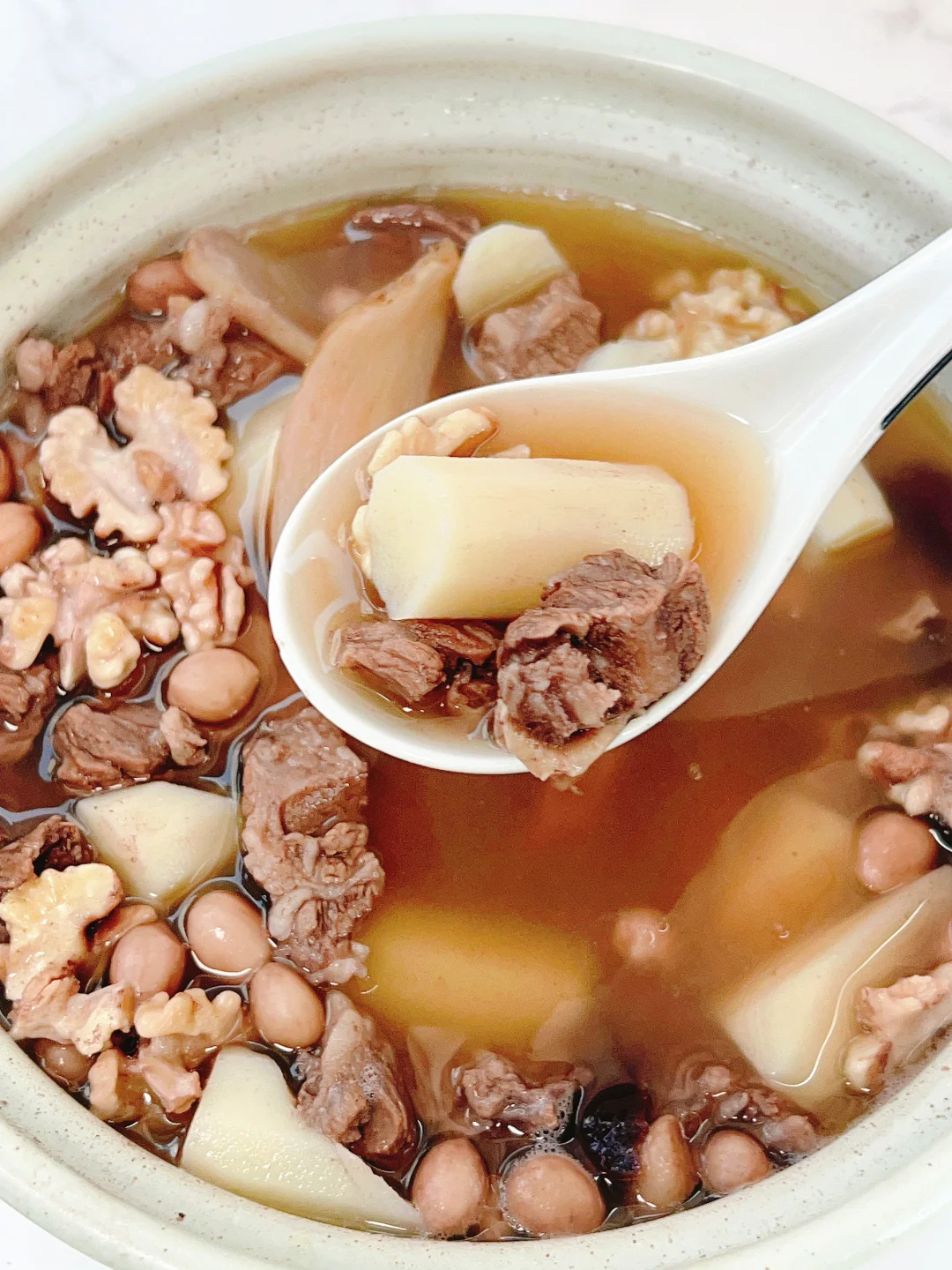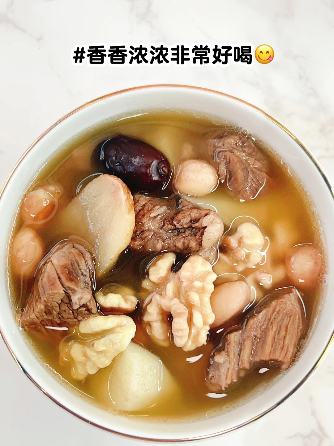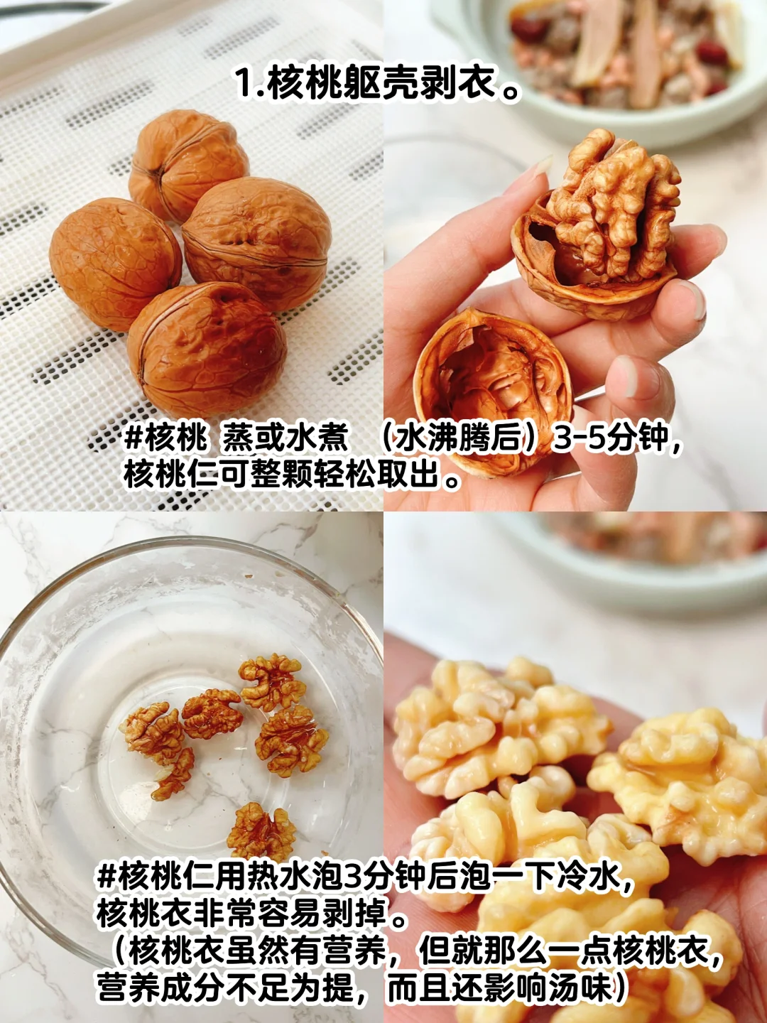 经常熬夜用脑🧠过度 如果开始出现▪️经常头痛🤕️、▪️对事情不起兴趣🫠、▪️感觉脑袋不够用😵‍💫漏东漏西、▪️半夜焦虑难受压力大😫、▪️上班不自觉摸鱼🐟。证明你的大脑已经很累了😮‍💨。 但由于作息不规律和饮食不正常,⭕️大脑无法好好的自然补充,这香浓美味的补脑汤一定要开始安排,日常煲给大人小孩老人家健脑也很不错。 ◾️——食材: ▪️天麻15g▪️核桃仁4-5颗▪️花生30g ▪️鲜山药100g▪️陈皮1瓣▪️牛腩400-500g ▪️红枣5颗▪️姜片 ⭕️牛肉:肉类补脑王丰富的锌、铁、vb ⭕️天麻、核桃花生:通络、增加脑活力 ⭕️山药、陈皮:健脾益气,促进汤的营养吸收 ◾️——做法: [一R]核桃躯壳剥衣。 (·核桃 蒸或水煮 (水沸腾后)3-5分钟,核桃仁可整颗轻松取出。 · 核桃仁用热水泡3分钟后泡一下冷水,核桃衣非常容易剥掉。⭕️核桃衣虽然有营养,但就那么一点核桃衣,营养成分不足为提,而且苦涩还影响汤味) [二R]天麻、陈皮、花生、陈皮需要清水泡发。 [三R]牛腩焯水洗净。 [四R]除山药外,全部食材入锅,加入1.5-1.8L水煲60分钟。 [五R]加入山药再煲30分钟,下盐调味即可。