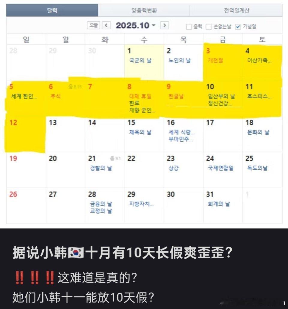 韩国人能不能别放假了从10月3日起,韩国将连续放假10天,虽然韩国没有将10月10日定为临时公共假期,但绝大部分韩国公司都会在这天放假,韩国学校在这天也放假不开学。