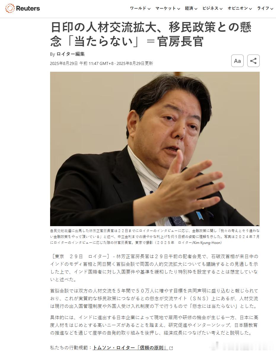媒体路透社:日本内阁长官称对扩大日本印度民间交流的移民政策的担忧是没有根据的。