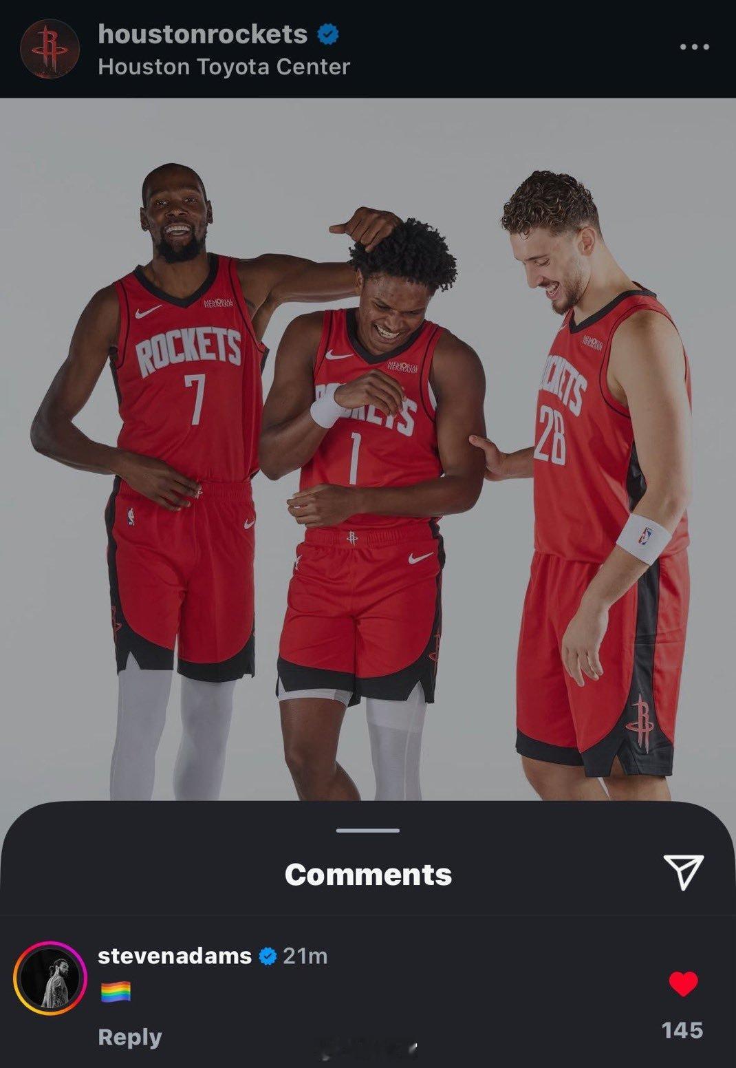 在火箭三人组的照片下,亚当斯留下了彩虹(同志)旗帜