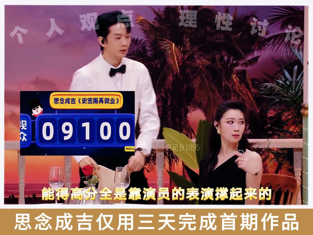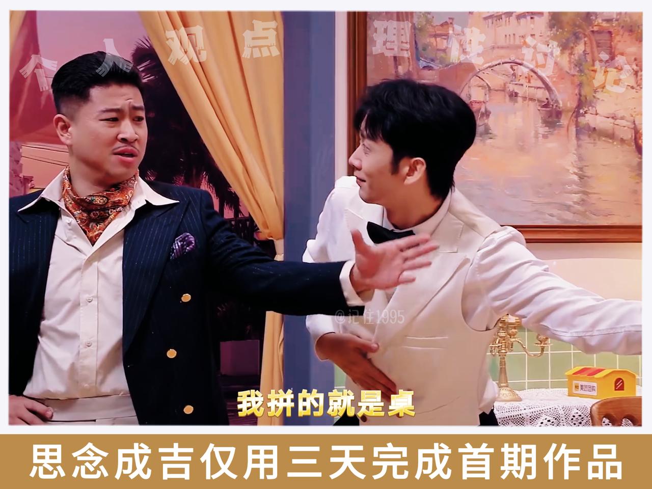 “思念成吉”的第一期作品居然是三天内完成的,一开始我还觉得这个本子平平无奇,能得高分全是靠演员的表演撑起来的,主要还是杨雨光实在太出彩了加了很多分。 但你要说这是三天内完成的,那就没得挑了,三天出一个十五分钟的喜剧作品,还能达到这种喜剧效果,我感觉已经到头了。 喜人奇妙夜基本上从上一季结束就开始筹备下一季,为什么会出现需要短短几天创作的情况呢? 首先是因为淘汰弃用的本子很多,导演组评估会先毙掉一批,如果展演效果不好,哪怕临近拍摄日期也可能再毙掉。其次是演员们火了也有很多其他工作了,很多走红的选手都是要安排档期左右顾及的。像蒋龙连第一期的正片都赶不过来拍摄,可想而知平时排练,想同时让几个很火的演员凑一起是很不容易的。 这大概也是节目组要让选手们进行组团的原因,后来甚至增加了整团淘汰的规则,要的就是强制队友之间要互相帮忙,提高节目的整体质量。