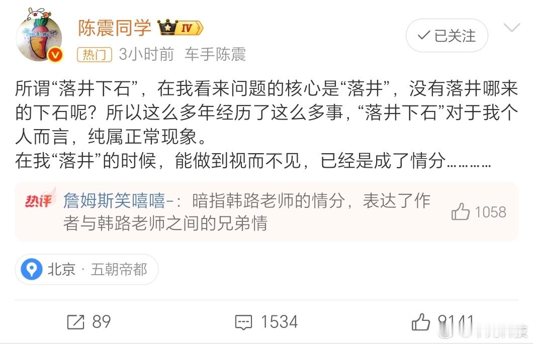 看到陈震谈落井下石,说明陈震 韩路之间还是有很多情分在的!陈震在落井的时候,韩路大哥全公司通知不要发帖不要点赞不要互动,以免事态恶化!这就是爱呀!