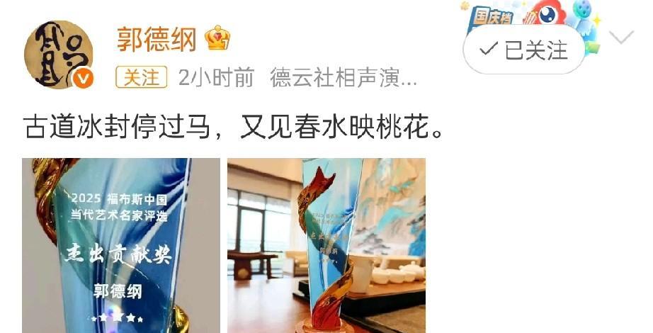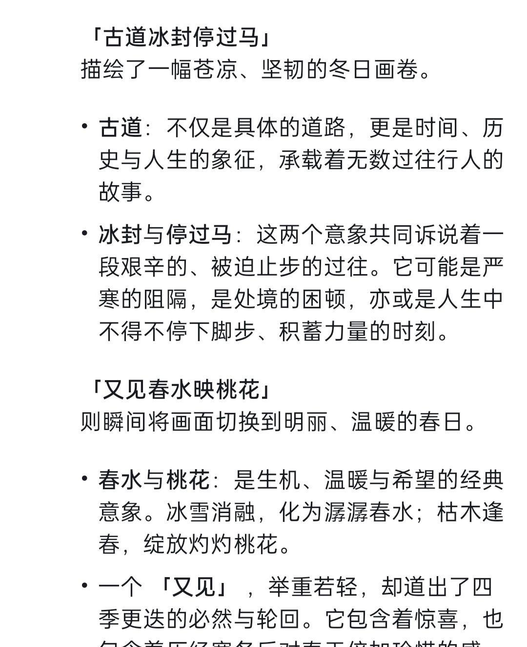 郭老师庆祝荣获福布斯当代艺术名家杰出贡献奖的这句词,没拽对啊。 “古道冰封停过马,又见春水映桃花”这是一句歌词,说的以前被情伤过,以为心冷了,不会再爱了,但是遇见对的人,心又动了,桃花开了。不是,轻舟已过万重山,又获殊荣勉励自己的意思。 虽然DeepSeeK的解读更符合郭老师想表达的意思,但我个人总觉得,桃花太过娇弱了,德云社应该是梅花更贴切。 福布斯给郭老师两个奖,23年的曲艺赛道的杰出匠人和25年的当代艺术名家杰出贡献奖,对于郭老师对于曲艺的坚持和成绩给与了最大的肯定,这次进入富人排行榜更有意义。#郭德纲# #郭老师经典语句# #郭德纲荣获福布斯当代艺术名家杰出贡献奖#