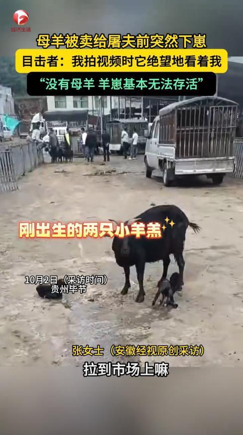 “万物皆有灵!”10月,贵州毕节,一女子拉着羊到市场上卖,刚卖给屠夫,其中一只母羊突然产下2只羊羔,随后一脸绝望的望着女子,由于没有母羊小羊也活不了,所以女子也无法收留小羊,全都留给了屠夫。网友:不应该不卖了吗? 贵州毕节菜市场里,母羊刚被张女士卖给屠夫,突然卧在地上产下两只湿漉漉的羊羔,起身时用头蹭了蹭张女士的衣角,眼睛直勾勾盯着她。 那眼神里的绝望,被围观者拍下来传到网上,网友吵翻了:“就不能不卖了吗?” 张女士后来在采访里说,那天凌晨四点就起床赶羊,家里急着用钱给老人看病,才咬牙把养了半年的几只羊拉去市场。 和屠夫谈价时,她还特意摸了摸这只母羊的肚子,觉得有点鼓,却没往怀孕上想,只当是羊吃得饱。直到钱刚算清楚,母羊突然腿一软,她才慌了神,掏出手机拍视频的手都在抖。 羊羔落地时还带着胎膜,母羊用舌头一点点舔干净,抬头看张女士的瞬间,她心里“咯噔”一下。 “我知道它想让我把小羊带走,”张女士说,“可我家里没条件养,母羊要是留下,之前谈好的钱就黄了,老人的药还等着买。” 旁边围观的人劝她“要不别卖了,等小羊长大还能多赚点”,屠夫也皱着眉说“这情况我也没遇过,要么你把羊拉回去,要么连小羊一起算在里面”。 张女士蹲在地上,看着母羊把小羊护在身后,突然想起去年冬天,这只母羊还救过家里的鸡。当时鸡窝被黄鼠狼盯上,是母羊撞开栅栏冲进去,用羊角把黄鼠狼赶跑了。 可眼下,她只能咬着牙说“就按之前说的,都留给你”,转身离开时,听见身后传来母羊的叫声,她没敢回头。 这件事传到网上后,有人骂张女士“无情”,也有人替她说话“不是谁都有条件讲情面”。 有个养羊的网友留言说,母羊临产前通常会烦躁不安,要是多观察几天就能发现,“不过真到了急用钱的时候,再灵性的动物也难敌现实”。 还有人分享自己的经历:去年家里的牛要卖,临上车前突然下跪,最后还是咬着牙卖了,“没经历过难处的人,不会懂这种无奈”。 后来有记者找到那个屠夫,他说当天没立刻处理母羊,而是找了个纸箱把小羊装起来,用奶粉试着喂。“母羊一直盯着小羊叫,我想着先养几天,要是有人想买活的,就便宜点卖了。” 没想到三天后,有个开农庄的老板看到视频找来,花了比市场价高两百块的钱,把母羊和小羊一起买走了,说要放在农庄里养着,不让它们再被屠宰。 张女士是从邻居嘴里知道这个消息的,那天她特意去农庄看了一次。隔着围栏,母羊正在吃草,两只小羊跟在后面跑,看到她时,母羊停下脚步,却没再像之前那样凑过来。 “知道它们好好的,我心里也松了口气,”张女士说,现在家里的老人病情稳定了,她找了份在餐馆洗碗的工作,“以后再也不想卖家里养的活物了,看到它们的眼睛,总觉得对不起。” 这件事慢慢没了热度,却让很多人明白:不是所有“无情”背后都是冷漠,有时候是生活的无奈; 而那些藏在动物眼里的灵性,也总能在不经意间,打动人心,给现实留一丝温暖的转机。 信息来源:《母羊被卖给屠夫前突然下崽。视频拍摄者张女士说,母羊和她对视时,一脸绝望。拍完视频后,自己就离开了,对于母羊和羊崽的最后归处,她也不清楚。》AHTV第一时间