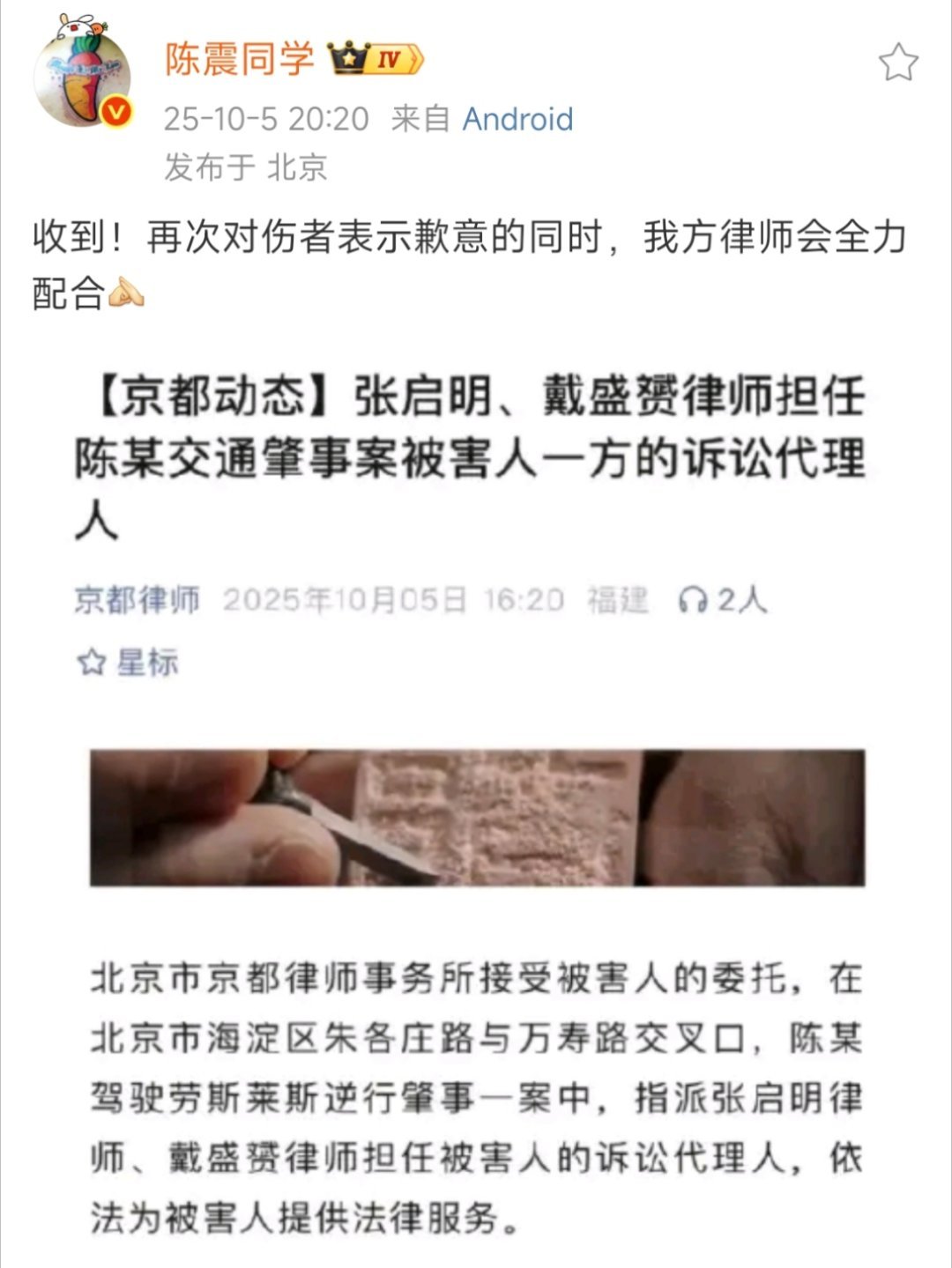 陈震车祸受伤司机家属发声京都律师事务所的通告,可圈可点,京都派出大阵仗,领头的律