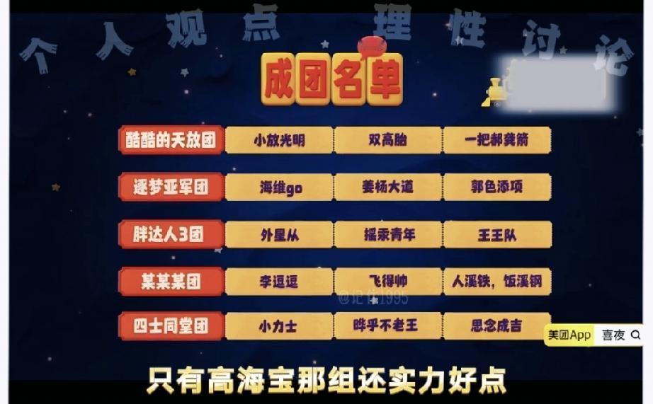 《喜人奇妙夜2》五团差距也太明显了,蒋龙/张弛是奔着早点淘汰选队友的吧,人气高演技好、分数靠前的不选,就奔着分数倒数被快剪的去选。 看看蒋龙他们的团队,只有高海宝那组还实力好点,但作为传统小品演员能不能融入这种新喜剧环境还很难说,毕竟他们第一期作品还是更偏向传统小品类型。 其他两组开局就是边缘角色,往年更是参加了跟没参加一样。不管是人气值、观众缘还是综合实力,蒋龙他们这团都是五个里垫底的。 整个团就靠团长撑着,这种阵容想不率先淘汰都难,合理怀疑蒋龙/张弛是后面档期太满想早点淘汰,毕竟接下来剧版喜剧之王要开播,作为导演的蒋龙肯定还有很多事情做。