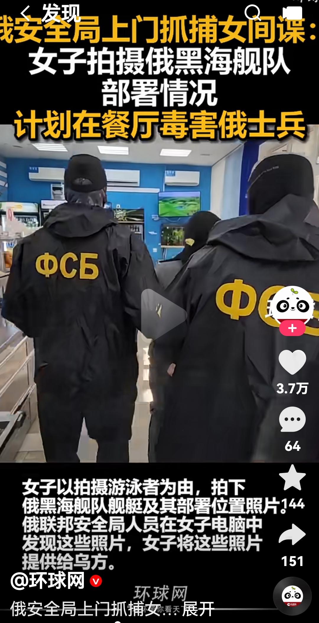 俄罗斯安全局上门抓女间谍 根据俄罗斯媒体报道,俄罗斯安全局逮捕了一名为乌克兰情报部门工作的女子 这名女子以旅游拍照为名拍摄了大量俄罗斯黑海舰队舰艇和位置图片 这名女子居住在黑海舰队附近,在饭店担任厨师,她还计划毒害俄罗斯防空部队士兵 一个国家只要有战争一定就会有叛徒,这就是明面战争和暗线战都要全力以赴 并且暗线战争伤害更加突然和危害更大外国间谍 伊朗抓捕间谍 图片来自环球网视频