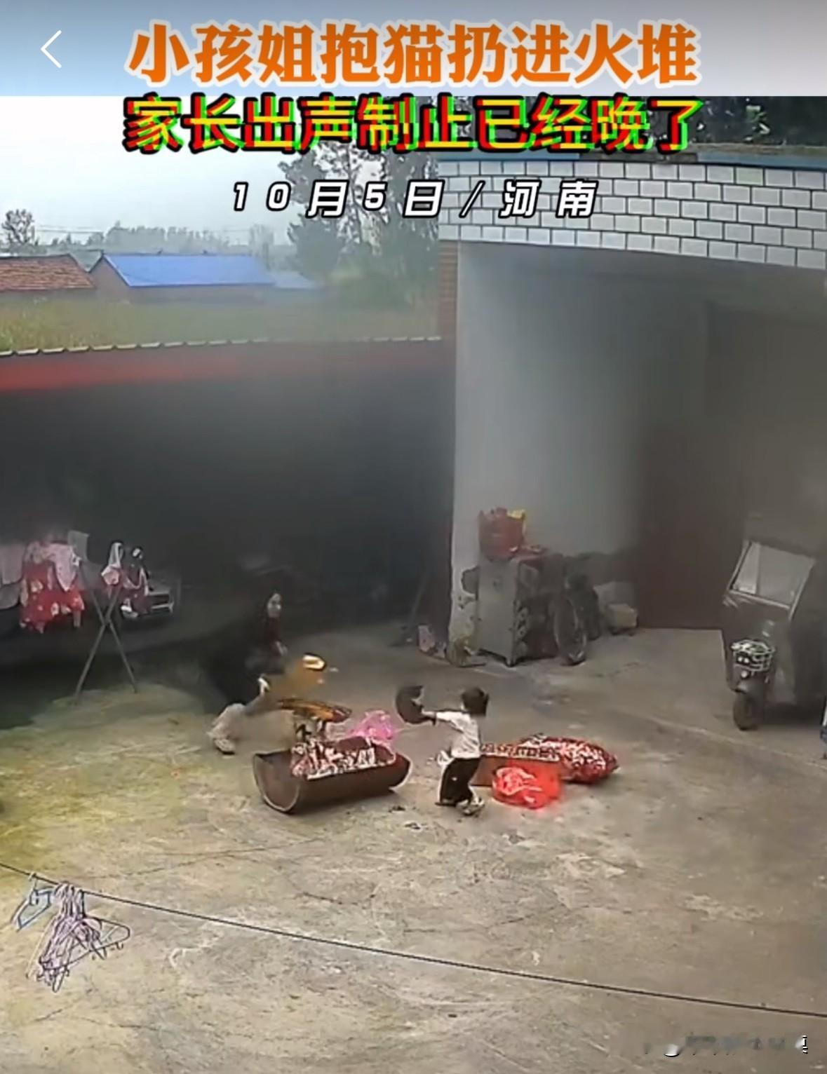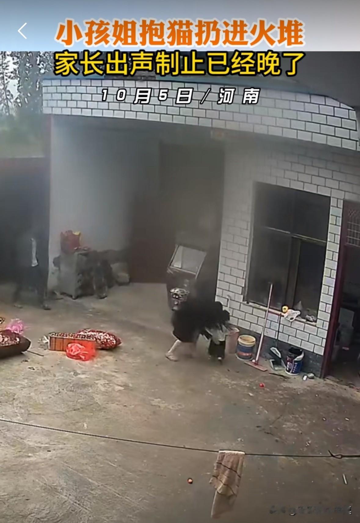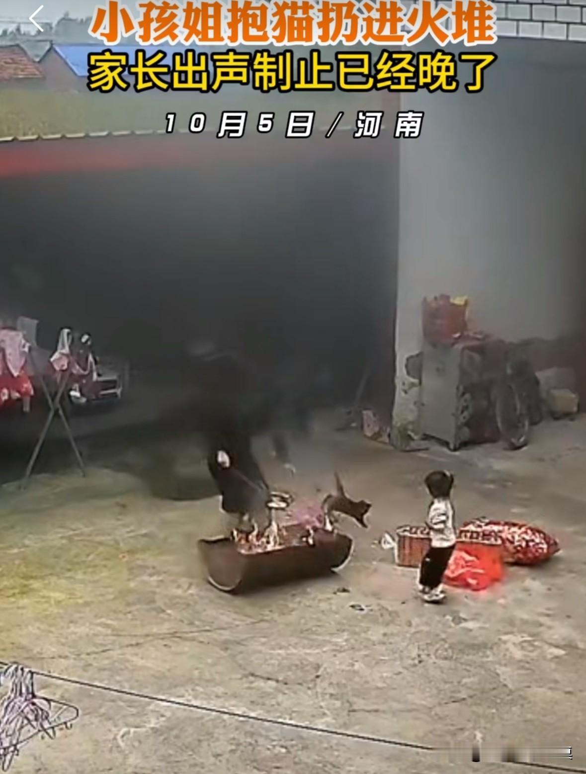 小女孩抱着猫,直接把猫扔进了火堆里! 女孩的妈妈看到后,立即出声制止,但是为时已