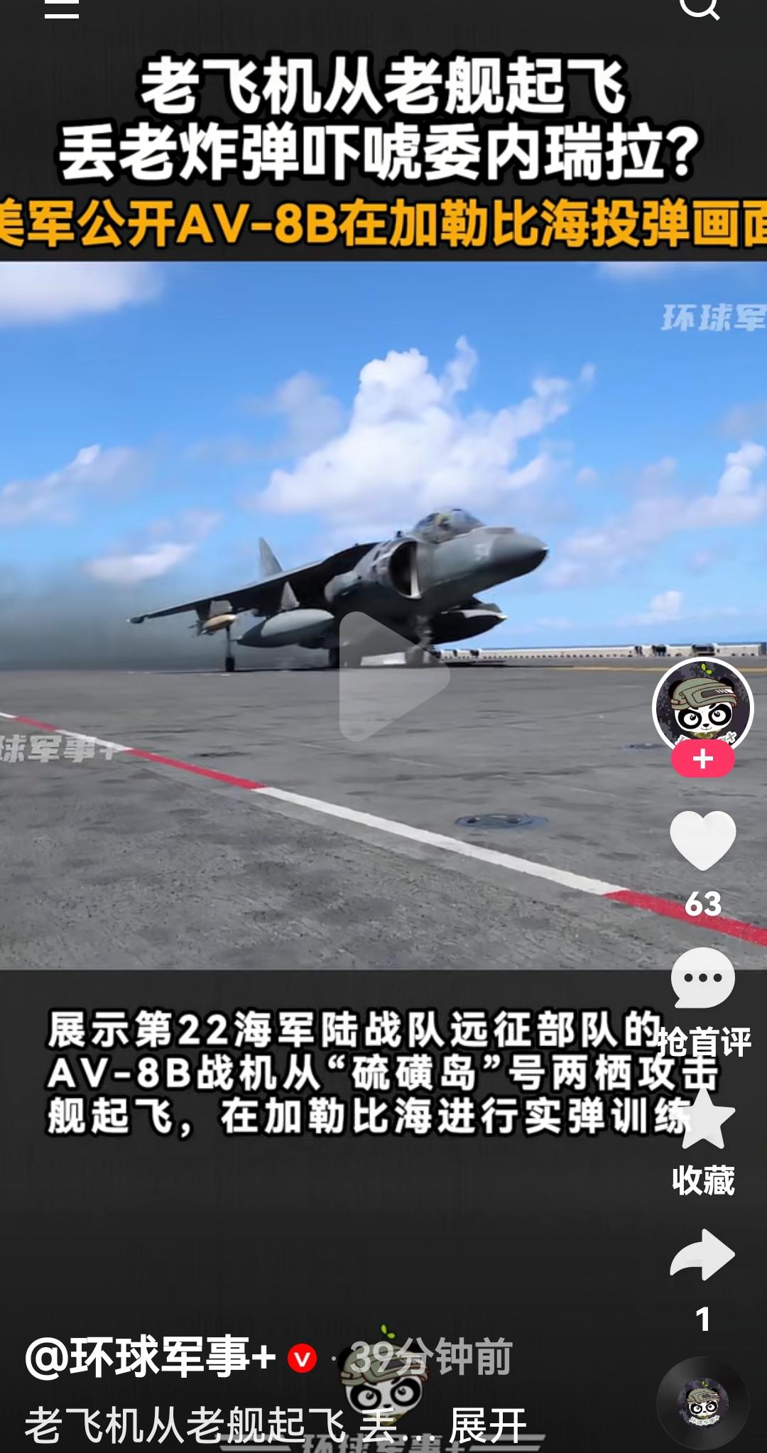 美国突然训练自己的老式飞机干嘛 根据媒体报道,美国南方司令部发布一段海军陆战队的战备训练 展示了第22海军陆战队远征军使用AV-8B战机从两栖攻击舰起飞训练 这艘两栖攻击舰已经服役25年,而AV-8B战机也已经服役42年 最近美国对委内瑞拉的军事压迫都是这用这样老式飞机训练,这是在迷惑对方吗 还是要搞突然袭击啊,最后美国是打委内瑞拉还是伊朗啊,这一会儿美国是各种在试探美军演习 美军军事行为 图片来自环球军事视频