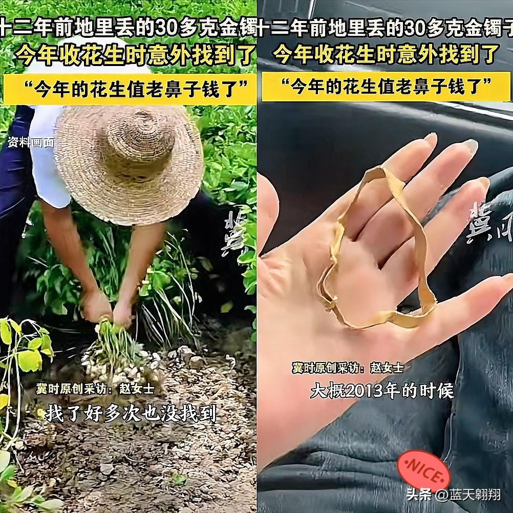 10月5日, 唐山一女子称,其姥姥12年前在自家花生地丢失的30多克金镯子,近日