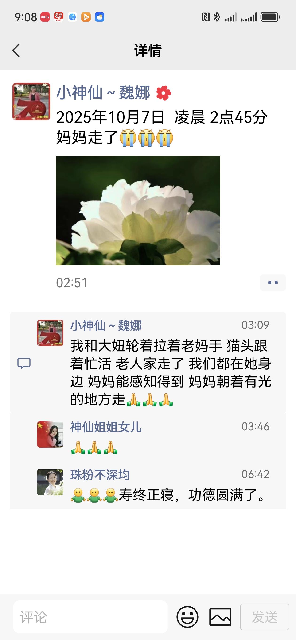 一大早看见小神仙姐姐发的朋友圈,她妈妈去世了。好像是96岁。 小神仙姐姐是我的网友,20多年了,我们没有见过面,但是她就如真实的我身边的亲友一样。 快到70岁的她每天早起会发朋友圈,内容是佛经道德经。 然后就是她骑着电动摩托车去养老院或者是医院看望自己的母亲。 阿姨从前是医院的护士长,老太太那么大的年纪耳聪目明的,90多还会点外卖。 小神仙姐姐的女儿也是我网友,她是天津肿瘤医院的护士,有两个孩子。 这两个小宝贝是我看着长大的,尤其是女孩(猫头)从前在电脑屏幕,如今手机屏幕。 会拳击散打,会游泳,这个女孩可厉害了。小神仙姐姐善良,对于外孙外孙女疼爱满满,对于母亲更是尽心照料。 好像知道阿姨时日无多了,好多的亲友都来过做最后的道别,好多都是国外赶回来的。 我看见阿姨去世的消息挺难过,但是也觉得释然了很多。老人家最近几年都是在医院度过的,做子女的包括外孙女还是曾孙辈分的都尽力了。 老人家人生圆满了。这一世功德圆满了。 人生在世,最后什么是你的
