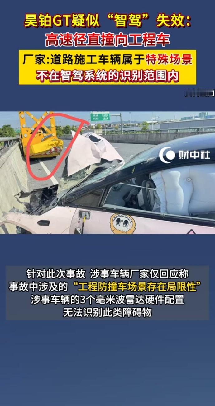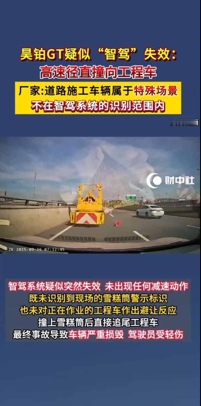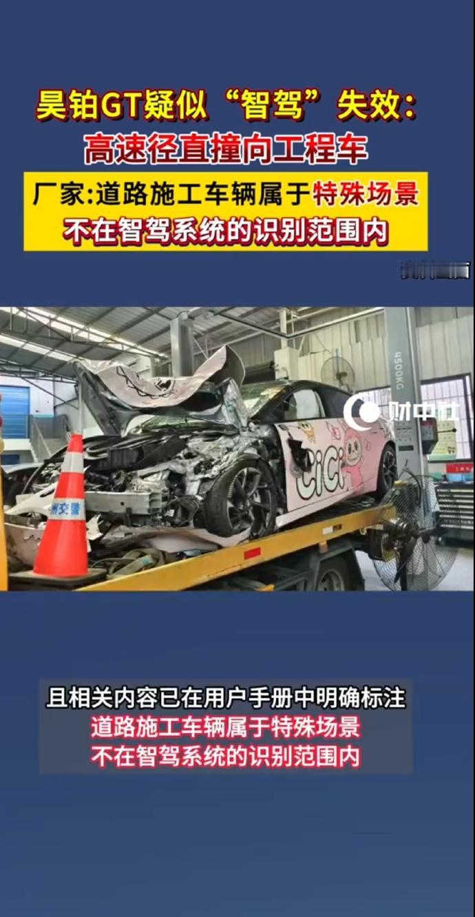 最近,一辆昊铂GT在高速路段行驶时,开启ACC(自适应巡航控制)的状态下,撞开前方设置的雪糕筒警示物,紧接着径直撞上了前方的一辆静止的工程车,这一过程中车辆未出现减速。对此,昊铂方面表示,防撞工程车属于用户手册的异形车,识别具有局限性,且在经过施工路段时需要退出ACC系统,采用全人工驾驶。你怎么看?