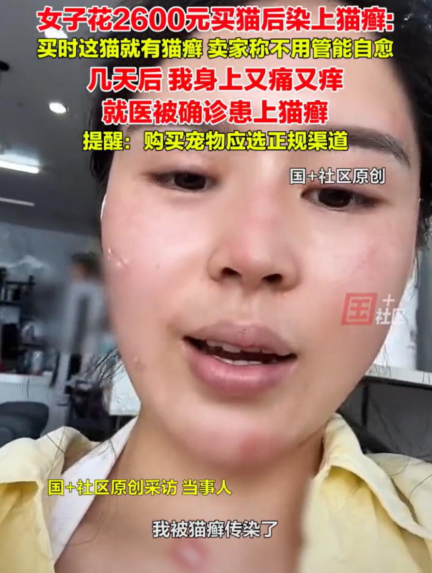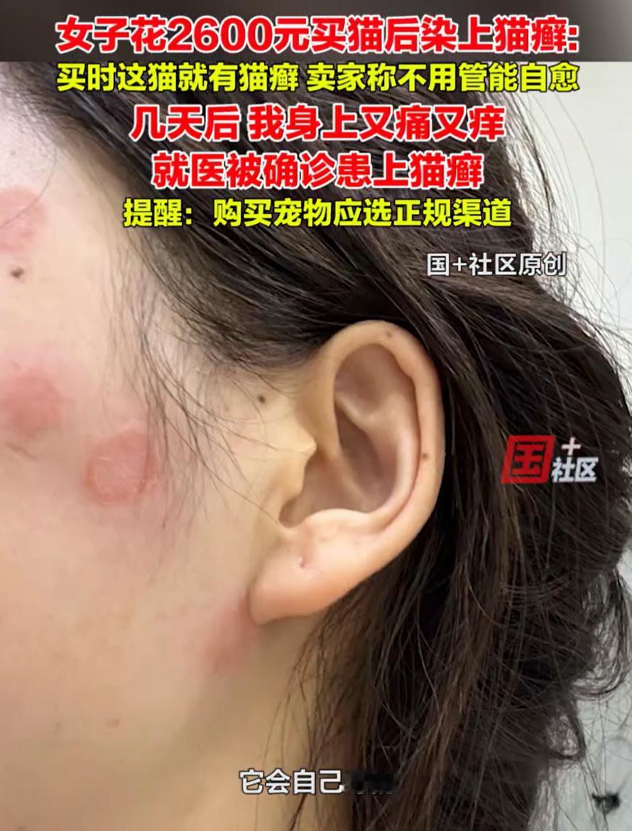 “这不是坑人嘛!”浙江嘉兴,女子花2600块买了一只猫,没想到,养了几天自己的脸上却长满了红斑,去医院确诊得了猫藓,可当初卖家却告知她,猫藓不用去治,可以自愈,而她正是信了这句话,才出了问题 女子介绍,当初买猫时,想着给生活添点乐趣,其实买猫的时候,卖家倒也提过一句,说这猫有点猫藓,但“不用治,也不用买药,自己能好” 女子听了也没多想,觉得既然卖家都这么说了,应该没什么问题。谁知猫接回家才几天,她就开始皮肤发红、发痒,原本以为只是普通过敏,没想到越来越严重,最后不得不跑医院 说起来,猫藓其实是一种真菌感染,在人抵抗力弱的时候,特别容易被传染。尤其是直接接触,或者共处一个密闭空间,孢子一飘,就容易中招。医生说,这病虽然不算大病,但恢复起来慢,痒起来难受,还容易留印,对爱美的年轻人来说,真是身心折磨 我觉得,这个事不能怪女子没经验,她只是个普通消费者,信了卖家的话很正常,谁买猫还想着对方会骗人呢 再说,新手确实不太懂猫藓有多容易传染,卖家反而该是那个最清楚这事的人。自己做宠物生意,就得明白这类问题的严重性,不能因为想快点出货,就一句“会自愈”糊弄过去 专业商家要做的,不是隐瞒,而是提前处理好。比如发现猫有藓,就该隔离、用药、等康复后再卖