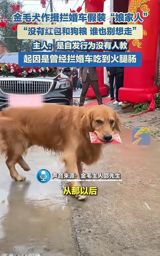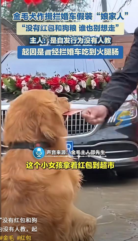 河南长垣,一只金毛看到婚车,竟然跑到路当中作揖拦车,没有红包和狗粮,谁也别想走,直到新郎给它送上200元红包,金毛才转身离开,给婚车让路,更神奇的是,看到摄影师对着自己,金毛还眨了眨眼睛! 10月2日,一男子养的金毛看到婚车后,主动上前阻拦,那样子明白了是要红包。 男子惊呆了,因为是自家亲戚的婚礼,亲戚看到后也不气恼,还有人拿出手机,把金毛的样子拍了下来。 新郎也很大方,看到金毛讨不到红包不罢休的样子,主动拿出红包,放进金毛嘴里,它叼着红包摇摇尾巴就离开了。 男子也觉得有趣,不过这金毛不是他教唆的,家里人也没教过它。 之前有个小姑娘,见到婚车时,给金毛说“坐”,让它拦在了一辆婚车前,当时的新郎也很开心下车给了一个红包。 金毛邀功似的摇摇尾巴,主动将红包拿给了小姑娘,小姑娘带它到超市买了一包火腿肠。 从此“拦婚车能吃到火腿肠”的种子,就在毛毛心中种下了,从那以后,只要看到婚车,它可能又想到了火腿肠的香味,即使没有人教,也学会自己拦车了。 毛毛要到了好几次钱,这让它更熟练了,甚至更加气势了! 好在没有人觉得烦,婚车看到它,还觉得它有“旺”的谐音,意味着好运气,十分讨喜。 这金毛太聪明了,知道拦婚车有好吃的,也知道大家的反应是喜欢它。 有人担心,金毛养成这样的习惯,会不会被伤害,还会养成经常去路边的习惯,容易碰到危险。 其实男子也做了解释,一般大家都会很小心,婚车也开的很慢,不会伤害到它。 金毛达到目的后,就会离开,也不会继续阻拦,人家一点也不贪心! 有网友感叹,见过拦婚车的老人,拦婚车的金毛还是头一次见,不过它太会活跃气氛了,婚礼的氛围都轻松了不少。 但小编还是觉得,金毛主人应该好好看管好金毛,不让让它经常阻拦别人的车,因为不管车速快慢,都会存在撞到它的风险。 安全永远是第一位的,如果爱它,就要让它处于安全的环境,平常满足一下它买美食的想法,也许就不会执拗于拦婚车了。 更重要的是,金毛的行为虽然是自发的,但也很容易被别人模仿。 一只金毛讨要红包是有趣,如果又出现了好几只呢?被人跟风模仿,引发类似情况的争议,那就不太好了。 对于这件事,你怎么看? (来源:闪电新闻 2025年10月4日 金毛犬作揖拦婚车假装“娘家人”,没有红包和狗粮,谁也别想走。主人:是自发行为没有人教,起因是曾经拦婚车吃到火腿肠)