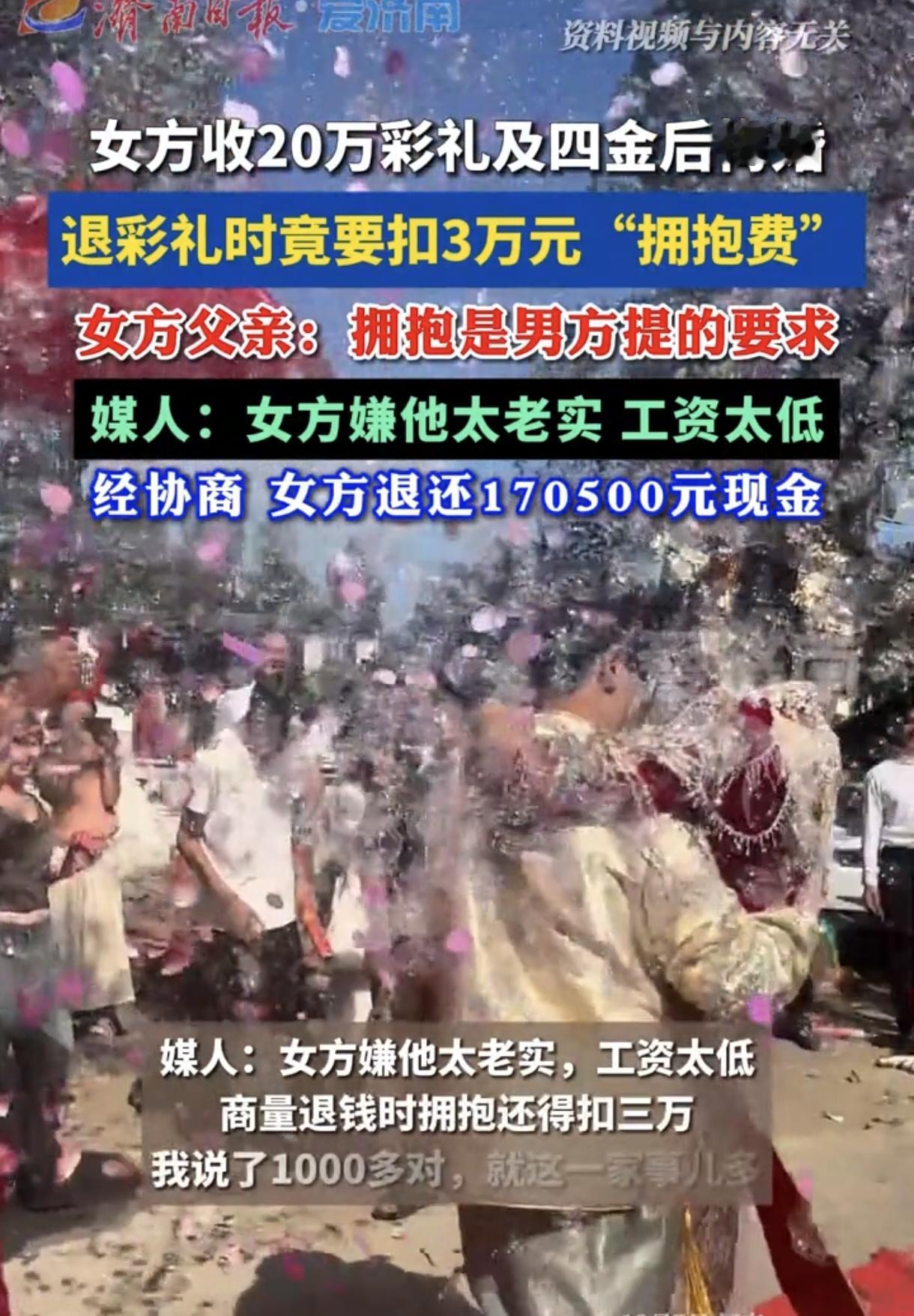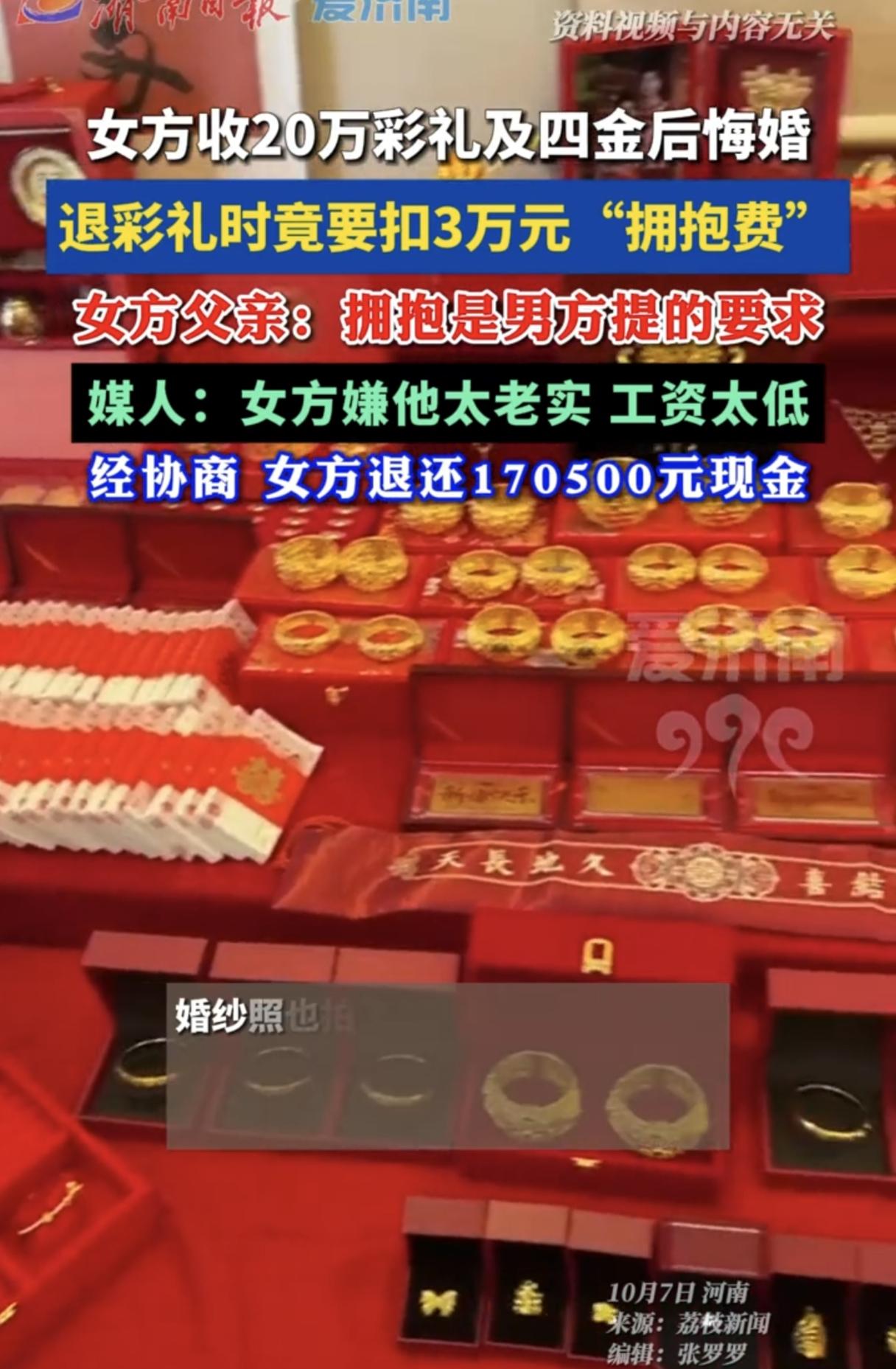 女子收20万彩礼及四金后突然悔婚,婚纱照拍了,婚宴酒店定了,女子却不结婚了,更奇葩的是退彩礼时竟要扣3万“拥抱费”,女子父亲表示拥抱是男方主动要求的。而说起为何要退婚?女子的理由更是十分拙劣又可笑。 2024年,河南平顶山,万先生通过媒人牵线与女方认识,双方初次见面后互有好感,便先试着相处了一段日子,随后正式确立了恋爱关系。 之后男女双方关系进展得也很顺利。常言,男大当婚,女大当嫁,双方也到了适婚年龄,便于今年1月正式订婚,同时确定了结婚吉日,将婚期定在了11月29日这天。 按说一切都在往好的方向发展,男方也在积极准备彩礼、四金、筹备婚礼事宜等,二人也即将走进幸福的婚姻殿堂,没想到就在结婚前一个月,女方突然悔婚,说不结婚就不结婚了! 关键女方已经前前后后收了男方20万彩礼和四金,二人婚纱照拍了,婚宴酒店也定了,所有要参加婚宴的亲朋好友也都挨个通知完了,这下突然悔婚,令男方一家猝不及防。 女子为何退婚呢?按她的话说:“没有矛盾,只是不想和他结婚”。媒人自是要问个清楚,不然怎么向男方交待,最终才得知女方是嫌弃男方太老实、工资低。这就奇怪了,二人谈恋爱那么久,女子现在才知道这些的吗?这理由也未免太牵强了吧。 而更为奇葩的又接踵而至,女子退彩礼时竟要扣除男子3万块“拥抱费”。对于拥抱一事,女子父亲表示是男方主动要求的;另有说法称,那是拍婚纱照时摄影师为了拍摄效果而安排的动作。女方这一家子真是令人十分无语,连媒人都忍不住吐槽:说了1000多对新人,就这一家子事儿多。 按说女方要求退婚,女方所收下的彩礼、四金等都应该全部返还,没想到却莫名其妙安个“拥抱费”想要少退还男方3万块。 最终,双方经过协调达成一致意见,女方退还男方170500元现金。可见,男方一家还是十分豁达的,没去过多深究。 女子这一行为引发网友热议,有网友说,就拥抱了一下就要了3万块?史上最贵拥抱,要是牵下手、亲一下,或发生了关系,是不是就分文不退了? 也有网友说,嫌老实都相处了快一年时间了为什么非得婚礼前才嫌老实?女方一家吃相太难看了。 还有网友说,这不诈骗吗?女子既然悔婚,就要全部退回彩礼四金等,所谓的“拥抱费”更是没有。 诚然,女子一家的行为大为不妥! 男方给20万彩礼及四金是以结婚为目的的,女子悔婚后结婚目的未达到,女方就应该全额返还。扣三万“拥抱费”既不合法也不合情理,更无任何法律依据支撑,其本质就是悔婚恶意侵占他人财产。 总之,女方悔婚本身就违背了婚恋约定,还要额外索要“三万拥抱费”克扣彩礼,更是毫无底线,完全突破了诚信与公序良俗这一底线,十分不可取。其实男方也可通过法律途径要求全额返还彩礼及四金。 这下女子可算火了,全国人民都知道了! (来源:爱济南新闻客户端)