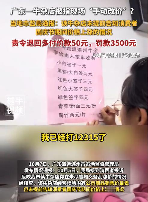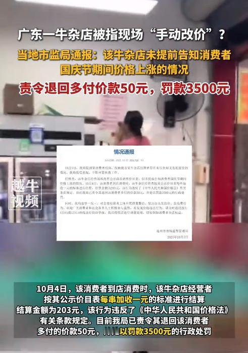 广东清远,女子在国庆期间到一家牛杂店消费,期间商家突然说全部菜品涨价1元,并且当场手动更改了价格。女子十分生气,指责商家乱涨价,谁知商家的态度还十分嚣张,称他们有权自定价格。无奈之下,女子向市监局进行了投诉,这下商家惨了。 据越牛新闻10月8日报道,女子是这家牛杂店的常客,由于这家牛杂店的菜品味道不错,所以女子经常会来光顾。 10月4日,女子再次来到牛杂店,点了153元的菜品,可工作人员结算时,却显示是203元。 女子提出质疑,表示价格不对。万万没想到,工作人员突然拿了一支笔,然后在贴在墙壁上的账单下面,用小字写上“每串加收1元”。 女子被工作人员的操作弄懵了,居然还有现改菜单价格的?对此,女子十分生气,当即打了12315进行了举报。 之后,女子通知了正在改价格的工作人员已经将此事进行了投诉,谁知对方却一脸无所谓的样子,继续更改价格。 那对工作人员的这个行为,法律上该如何定性? 工作人员自称可以自主定价,这句话其实没有什么错。 我国目前实行了三种定价方式:一种是市场调节价,由经营者自行制定价格;一种是政府指导价,由政府部门按照定价权限和范围确定价格幅度,并指导经营者制定价格;另一种是政府定价,由政府部门决定商品的价格。 这家牛杂店属于私营企业,所以一般适用市场调节价,即商品价格由商家自行决定。 不过,商家虽然有权给自家菜品加价,但是加价行为必须明码标价,让消费者知道且了解菜品真实价格,由消费者决定是否接受新的价格。 《消费者权益保护法》第8条规定,消费者享有知悉其购买、使用的商品或者接受的服务的真实情况的权利。第9条规定,消费者享有自主选择商品或者服务的权利。 但是本事件中,女子已经点完了菜品,而商家却突然按照新的价格来算账,甚至当场就在价目表上进行改价,这显然侵犯了女子的知情权和自由选择权,构成消费欺诈。 因此,女子是有权要求商家退还多收的50元。 其次,根据《明码标价和禁止价格欺诈规定》第6条规定,经营者应当以显著方式进行明码标价,明确标示价格所对应的商品或者服务。经营者根据不同交易条件实行不同价格的,应当标明交易条件以及与其对应的价格。 由此可见,商家临时更改菜单的价格已经违反了明码标价规定。作为市场监管部门,应当责令改正,并可以处3万元以下罚款;情节严重的,处3万~10万元罚款。 目前,市场监管部门已经对商家作出了罚款3500元的处罚,并且商家已经退还了女子50元的差价。 对此,有部分人认为这是小题大做,毕竟酒店在节假日一涨就涨了几百上千的,怎么市场监管部门就不去管管?这才涨1块钱就要罚款?太苛刻了! 但也有部分人认为,怎么才罚3500元?这种行为不应该顶格处罚吗?就是因为罚得太轻,所以才助长了一些不良商家的嚣张气焰。 对此,您怎么看?欢迎留言交流。
