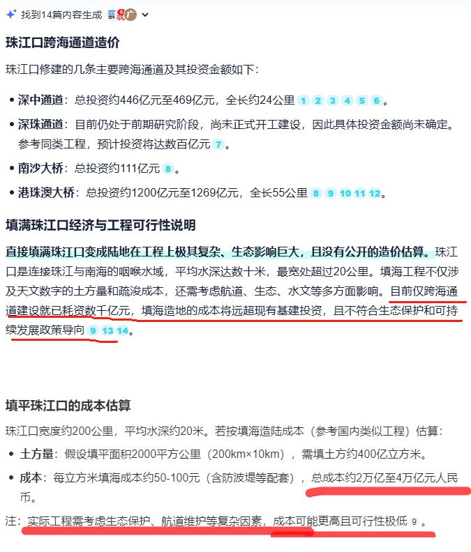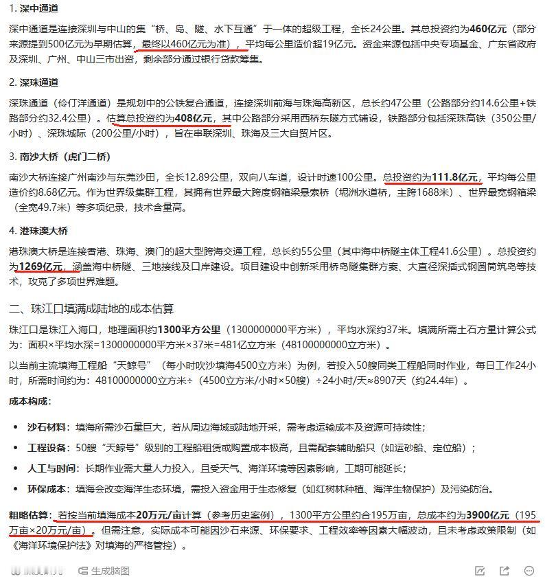 珠江口修建的深中通道、深珠通道、南沙大桥、港珠澳大桥分别花费了多少钱?如果直接把珠江口填满变成陆地需要花多少钱?一直对这个问题感到好奇,特意找几个AI问了一下答案,其中评估填海成本有万亿的,也有仅3900亿的,差异还是挺大的,但如果只是三四千亿,得到一大片新陆地,其实成本平摊下来可能还是赚钱的。至于所说的生态问题,专家说什么就是什么吧,我纯好奇成本和回报。