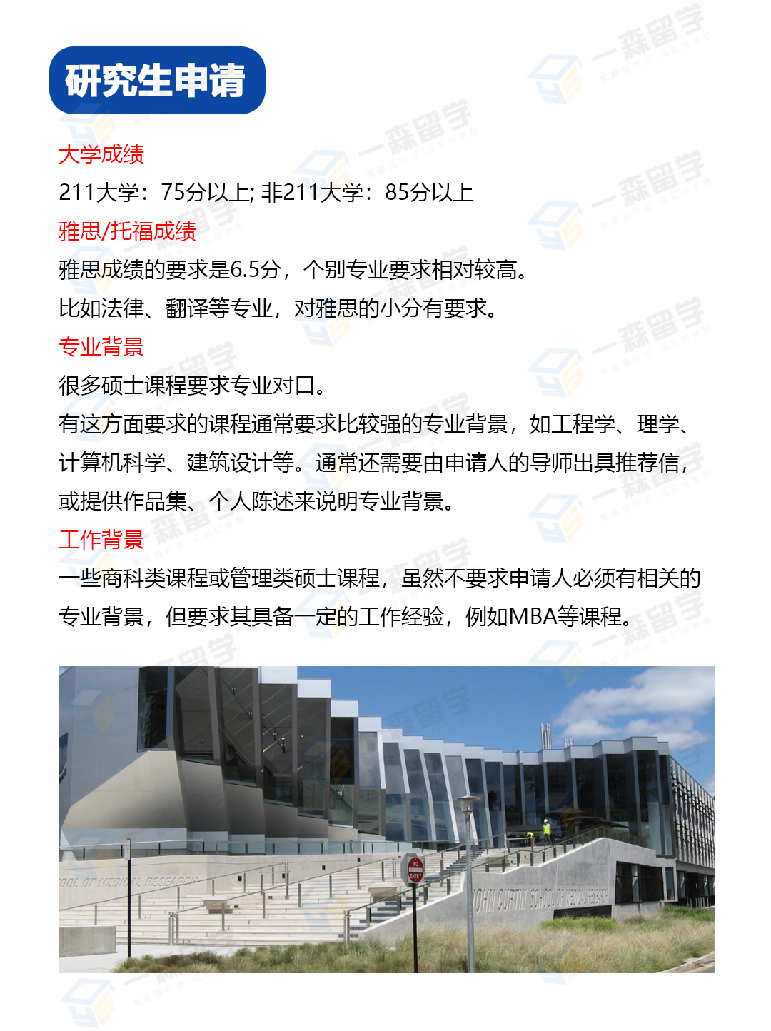 本科申请 读完高二的学生,可通过预科课程作为过渡,再进入澳洲国立大学本科 高中在读或者毕业生,可通过Diploma课程申请澳洲国立大学本科 参加高考的学生,高考分数达到当地本科一本线,可申请澳洲国立大学本科 在国内就读大学的本科生,综合分数达到一定的专业需求,也可申请澳洲国立大学本科 英语语言成绩,其中雅思不低于6.5分,单项不低于6分;或者托福网考不低于80分,其中写作与阅读不低于20分,口语与听力不低于18分 研究生申请 大学成绩:211大学75分以上; 非211大学85分以上 雅思/托福成绩: 雅思成绩的要求是6.5分,个别专业要求相对较高 比如法律、翻译等专业,对雅思的小分有要求 专业背景: 很多硕士课程要求专业对口 有这方面要求的课程通常要求比较强的专业背景,如工程学、理学、计算机科学、建筑设计等。通常还需要由申请人的导师出具推荐信,或提供作品集、个人陈述来说明专业背景。 工作背景: 一些商科类课程或管理类硕士课程,虽然不要求申请人必须有相关的专业背景,但要求其具备一定的工作经验,例如MBA等课程。