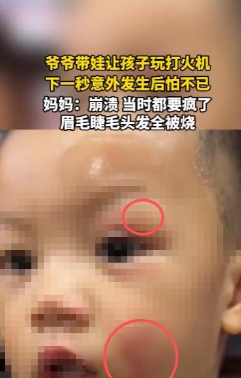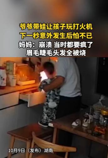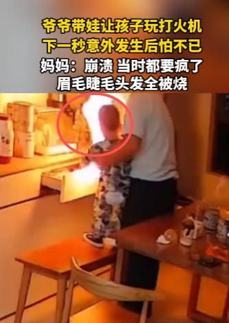 “悲剧还是发生了!”10月9日,湖南,一爷爷在家带孩子时给他玩打火机,下一秒打火机突然窜出巨大的火苗,孩子的眉毛睫毛头发全部被点着,脸上的皮肤也被烧伤,网友:不能让粗心的老人带孩子! 部分老人带孩子时安全意识比较浅薄,考虑问题不全面,他们往往会将危险物品给孩子玩,酿成的悲剧不计其数。 一位爷爷在家带孩子,他将孩子抱到凳子上,自己在抽屉里翻出一个打火机拿给孩子玩,谁知,按开打火机的一瞬间,忽然窜出了巨大的火苗,爷爷吓得赶紧将打火机丢在了地上。 这一切发生的太突然,当时打火机距离孩子的脸不足10cm,火苗冲出的瞬间就烧到了孩子的脸,爷爷的“补救措施”显然有点晚了。 据孩子妈妈说,自己看到家中的监控时直接崩溃了,孩子的半边脸被烫伤,脸颊和眼皮红肿,眉毛睫毛甚至是前额的头发都被火烧到。 这打火机应该是太久没用出了故障,才导致发生这种事情,估计老人也没想到小小的火机竟然能喷出如此大的火,幸好孩子受的伤不算太严重,火也及时熄灭。 不少网友认为这位爷爷太不靠谱了,如果需要把孩子给老人带,一定要和老人讲好不要给孩子玩危险物品! 信息来源:《爷爷带娃让孩子玩打火机,下一秒意外发生,妈妈:当时都要疯了》观象视频