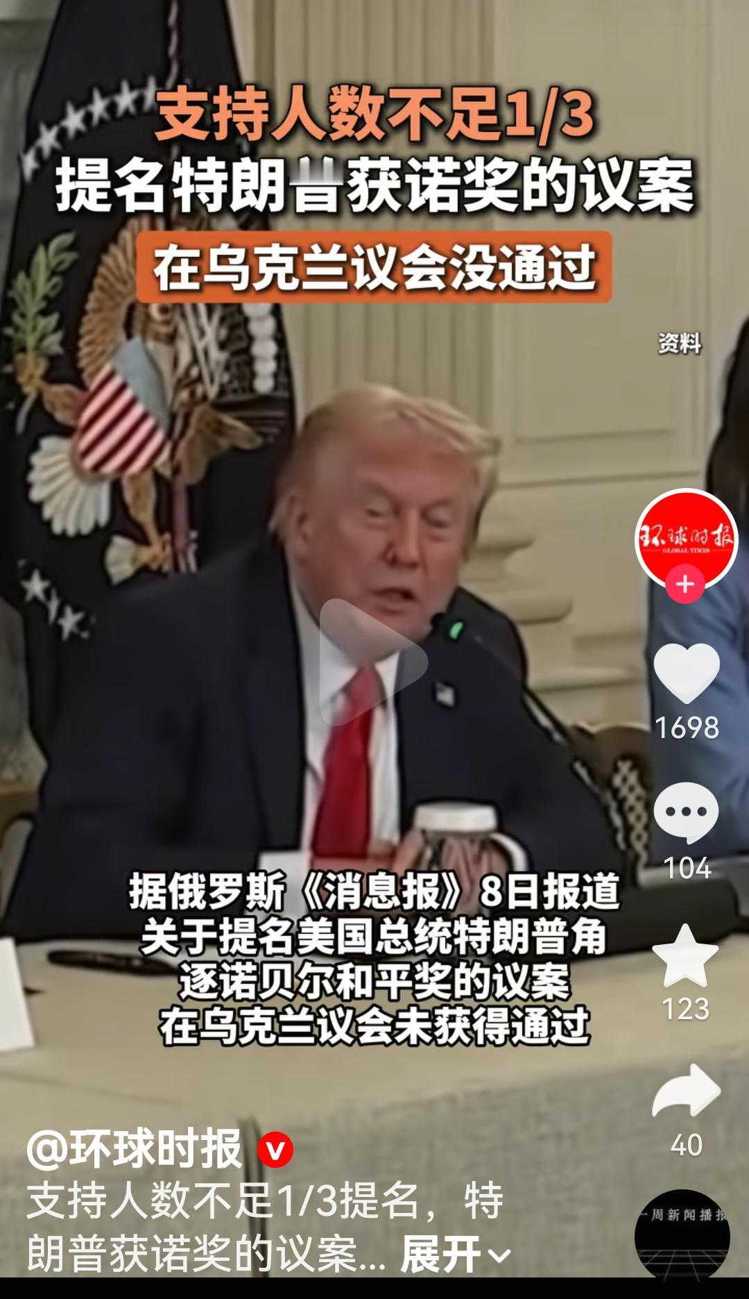 乌克兰议会没让通过特朗普提名诺贝尔和平奖 根据俄罗斯媒体报道,关于提名特朗普获得诺贝尔和平的议案在乌克兰议会没有通过,赞成人数不到三分之一 特朗普万万没想到啊,最后干他的是乌克兰啊 心心念念的奖没了,乌克兰议员说,完全没有信心说明特朗普可以促成俄乌冲突结束,特朗普都是骗人的,所以乌克兰撤销了提名他获得诺贝尔和平奖的议案 印度为何用人民币结算俄罗斯石油 美若向乌提供战斧导弹你怎么看 图片来自环球时报视频