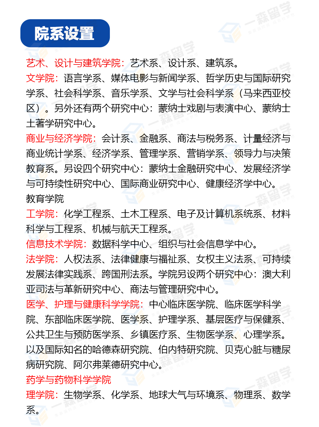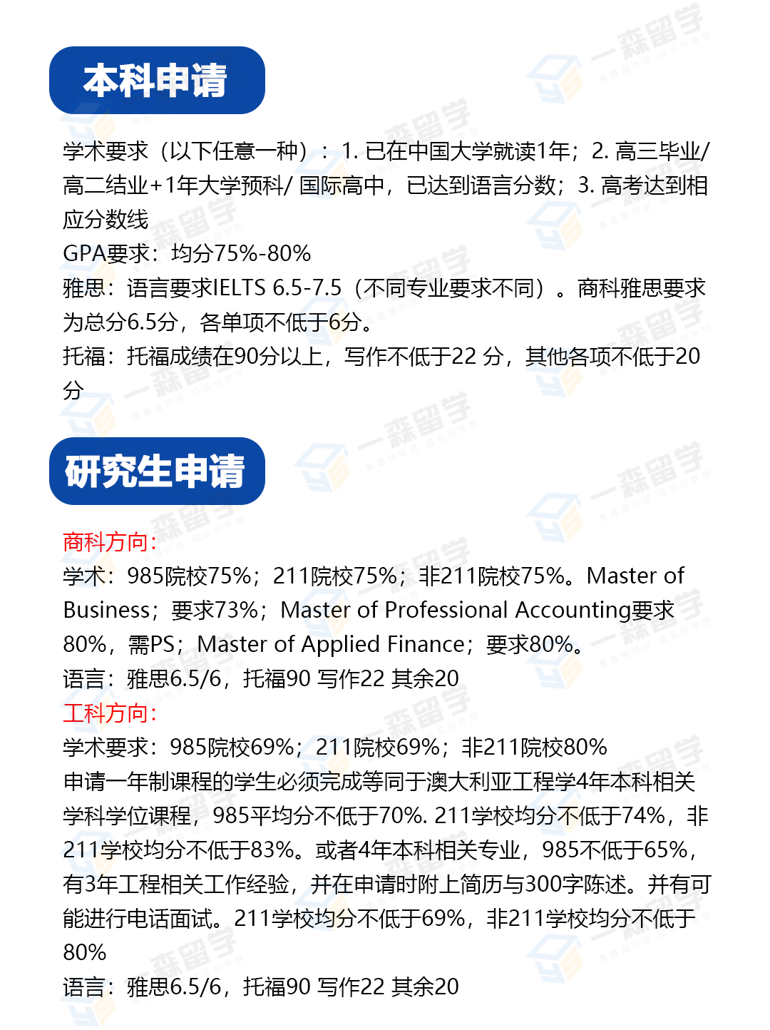 本科申请 学术要求(以下任意一种):1. 已在中国大学就读1年;2. 高三毕业/高二结业+1年大学预科/ 国际高中,已达到语言分数;3. 高考达到相应分数线 GPA要求:均分75%-80% 雅思:语言要求IELTS 6.5-7.5(不同专业要求不同)。商科雅思要求为总分6.5分,各单项不低于6分 托福:托福成绩在90分以上,写作不低于22 分,其他各项不低于20分 研究生申请 商科方向: 学术:985院校75%;211院校75%;非211院校75%。Master of Business;要求73%;Master of Professional Accounting要求80%,需PS;Master of Applied Finance;要求80%。 语言:雅思6.5/6,托福90 写作22 其余20 工科方向: 学术要求:985院校69%;211院校69%;非211院校80% 申请一年制课程的学生必须完成等同于澳大利亚工程学4年本科相关学科学位课程,985平均分不低于70%. 211学校均分不低于74%,非211学校均分不低于83%。或者4年本科相关专业,985不低于65%,有3年工程相关工作经验,并在申请时附上简历与300字陈述。并有可能进行电话面试。211学校均分不低于69%,非211学校均分不低于80% 语言:雅思6.5/6,托福90 写作22 其余20
