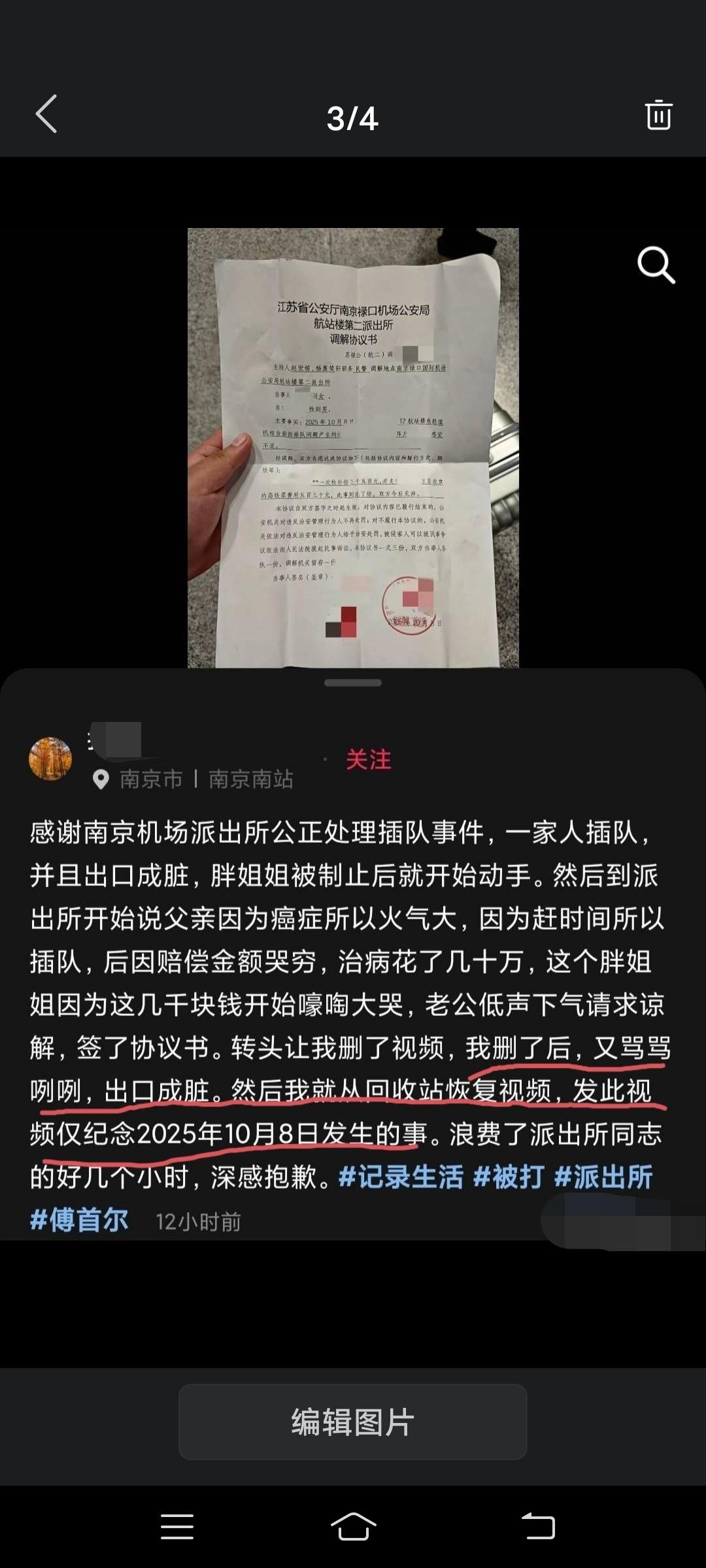 10月8日,南京禄口机场,一家四口插队被其他乘客阻止后辱骂并且扇耳光,警方介入调解后打人者赔偿3500元。不料对方好声商量要求删视频,博主删视频后对方态度又变了,开始骂骂咧咧的,博主一怒之下又恢复了视频,发出了视频…… 据红星新闻10月9日报道,国庆假期的最后一天,南京禄口机场里满是拖着行李准备返程的旅客,大家沿着标识有序排队,等着完成值机或安检流程。 戴先生也在其中,他本职是名程序员,那天原本想着顺利办完手续赶飞机,没料到一场无妄之灾正等着自己。 就在戴先生跟着队伍慢慢往前挪的时候,四个人突然从旁边走到了他前面,直接插进了队伍里。 这是一家人,看起来丝毫没觉得插队有什么不妥。 戴先生见状,上前轻声提醒:“大家都在排队,插队不太合适,要不您也按顺序来?” 可他的善意提醒,换来的不是道歉,而是对方的强硬对抗。 这家人里的父亲最先动了手,他抓起自己的行李箱,朝着戴先生的箱子和腿重重撞了过去,力道又急又重。 紧接着,家里的年轻男子开了口,满口脏话朝着戴先生骂了过来; 女子的母亲也凑上前,嘴里的指责声不停,几个人围着戴先生,形成了围攻的架势。 更让人愤怒的是,这家里一位胖胖的女子,没说几句话就突然抬手,对着戴先生的脸扇了两个耳光,力气大得直接把戴先生扇倒在地上。 戴先生想拿出手机记录下眼前的情况,刚掏出手机,女子的老公又冲过来,对着他继续辱骂,哪怕镜头对着自己,态度依旧嚣张,没有半分收敛。 被打后,戴先生立刻拨打了报警电话。 很快,南京机场派出所的民警赶到现场,将双方都带到了警务室进行调解。 调解时,这家人完全避开了自己辱骂、打人的核心问题,反而不断找借口。 一会儿说家里父亲得了癌症,情绪控制不住才发火; 一会儿又说赶时间怕误机,所以才插队,语气里满是委屈,仿佛自己才是受害者。 聊到赔偿时,他们更是开始哭穷,动手打人的胖胖女子当场就哭了起来,说父亲治病已经花了几十万,现在实在拿不出钱赔偿。 戴先生一开始并不想和解,他觉得对方做错了事就该承担相应责任,可转念一想,要是坚持追究,后续还要去医院验伤,会耽误自己上班,最后还是选择了让步。 经过协商,这家人最终同意赔偿戴先生3500元,另外还要支付530元的交通出行费。 签调解协议的时候,女子的老公反复跟戴先生说好话,恳请他把录下的视频删掉。 戴先生看着对方态度软化,便当场删除了视频,想着事情就此了结。 可谁能想到,刚走出警务室,这家人的态度就来了个180度大转弯。 尤其是之前动手的胖胖女子,嘴里又开始骂骂咧咧,说的话很难听。 戴先生听见后又气又无奈,自己已经让步,对方却毫无悔改之意。 于是他回到家后,把之前删掉的视频恢复了过来,发布到了社交平台上,发布时也没有给这家人打码。 有人担心他这样做会侵犯肖像权,戴先生回应说,他提前咨询过律师,对方违反公序良德在先,自己的行为并不构成侵权。 这件事在网上传开后,引发了不少网友的讨论。 有网友觉得赔偿金额太低,说之前有类似案例,被打一耳光就获得了1万元赔偿,现在戴先生挨了两耳光才拿到3500元,明显不合理; 还有网友吐槽警方的调解像是“和稀泥”,对方都动手打人了,却没有被拘留,这样的处罚难以起到警示作用; 也有网友评价这家人“不是一家人不进一家门”,从插队到打人,再到事后变脸,全程没看出半点对规则的敬畏和基本的素质。 其实,在公共场所排队是最基本的秩序,戴先生只是提醒他人遵守规则,却因此遭到打骂,换成谁都会觉得委屈。 这家人拿“父亲患癌”“赶时间”当借口,可这些根本不是破坏规则、伤害他人的理由。 生病值得同情,但不能把别人的善意当成纵容自己蛮横的资本; 赶时间可以提前规划出门时间,而不是靠插队打乱所有人的节奏。 戴先生最后恢复视频,也不是想故意报复谁,更多的是想让大家看到事情的真相,让这家人明白,做错事就该有认错的态度,不是靠撒泼、装可怜就能蒙混过去的。 今天的分享到这里就结束了,大家对此事有何看法,欢迎在评论区留言和讨论,感兴趣的可以点击头像加关注,我将每日更新优质内容,我们下期见。 信源: 原文登载于红星新闻2025年10月09日关于《南京禄口机场乘客阻止插队被扇耳光,当事人:对方已道歉,补偿3500元,公安部门已经介入》的报道