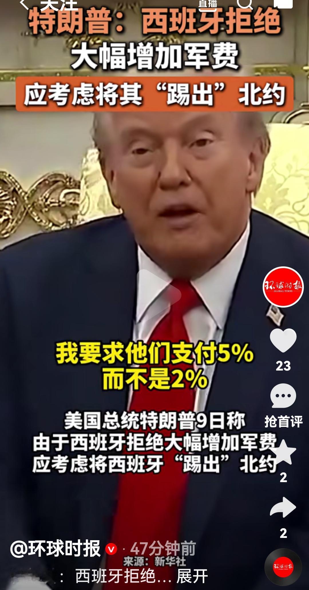 特朗普要把西班牙踢出北约 根据媒体报道,10月9日特朗普说由于西班牙不愿意增加军费开始将考虑把西班牙从北约成员踢出 在今年6月份北约峰会期间,在美国的压迫下,北约成员国答应,北约的国防支出,从GDP占比从目前的2%提升至5% 西班牙首相虽然当时签了字,但是还是不愿意提升,还在维持在当前水平2.1% 特朗普说这是不可饶恕了,,必须提高军费,不提高就开除成员身份如何看待美国政府“关门”持续 以色列若失去美国支持后续会怎样发展 图片来自网络环球时报视频